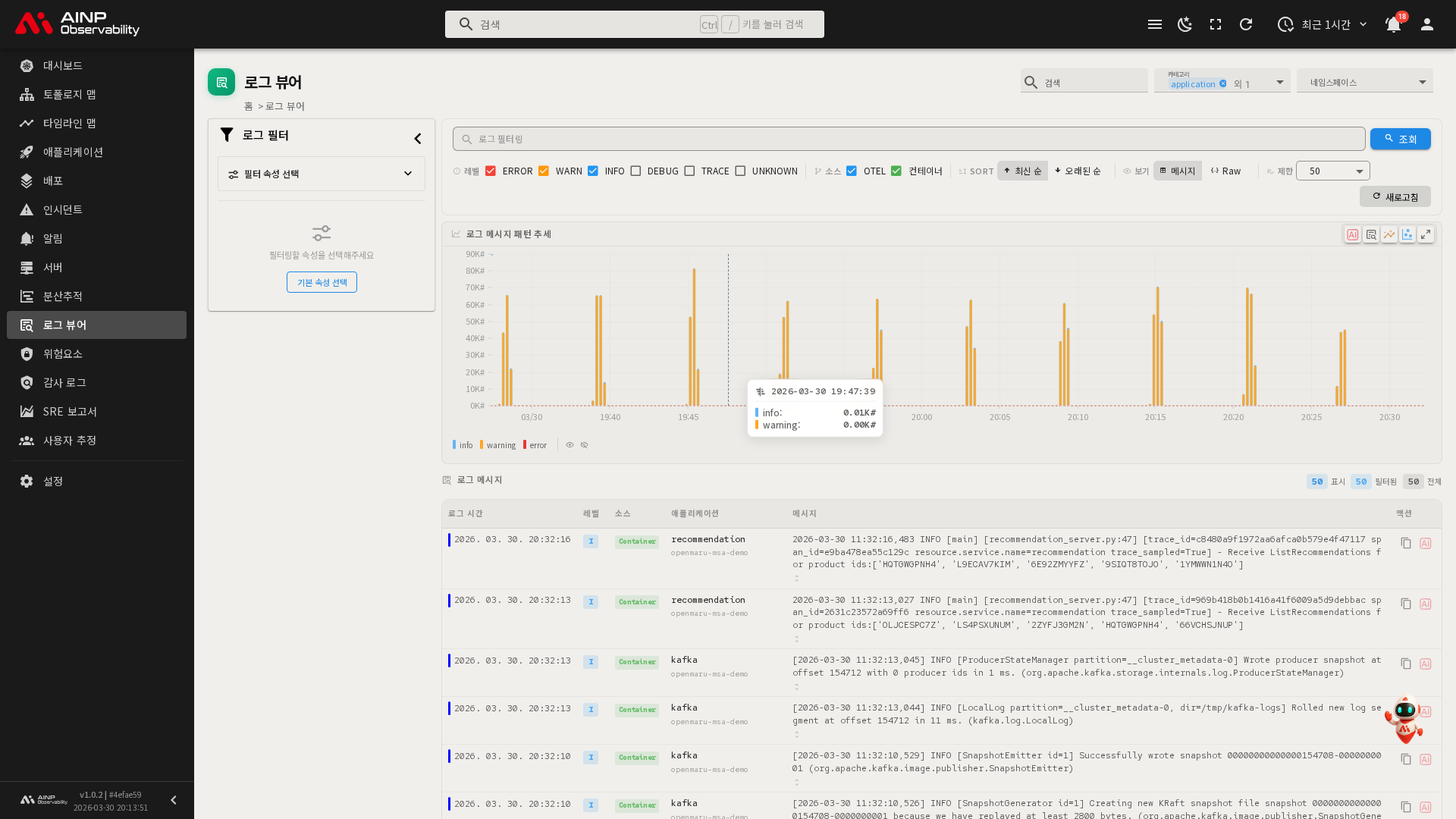 키워드 검색, 레벨 필터, 소스 필터, 속성 필터를 조합하여 원하는 로그를 빠르게 찾을 수 있으며, 로그 메시지 패턴 추세 차트를 통해 시간대별 로그 발생량 변화를 파악할 수 있습니다.