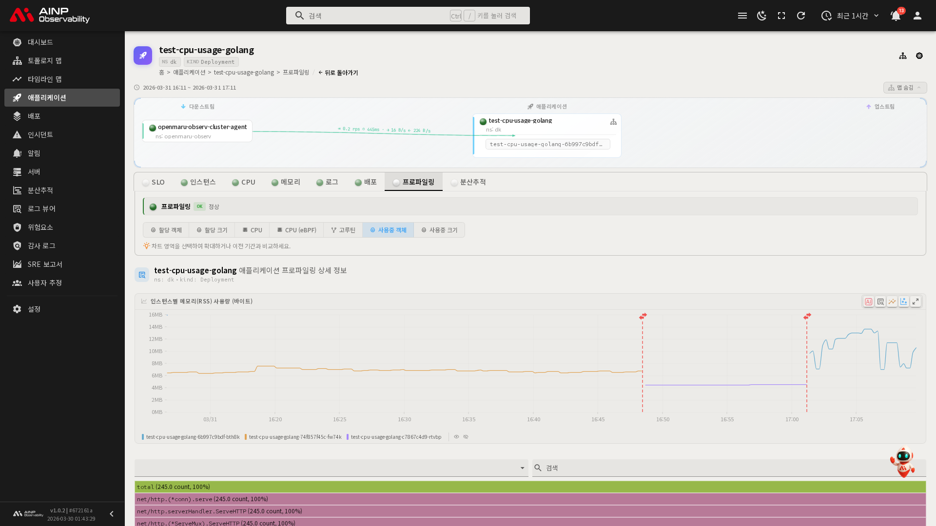 애플리케이션의 리소스 사용 패턴을 플레임 그래프(Flame Graph)로 시각화하여 성능 병목을 분석합니다.