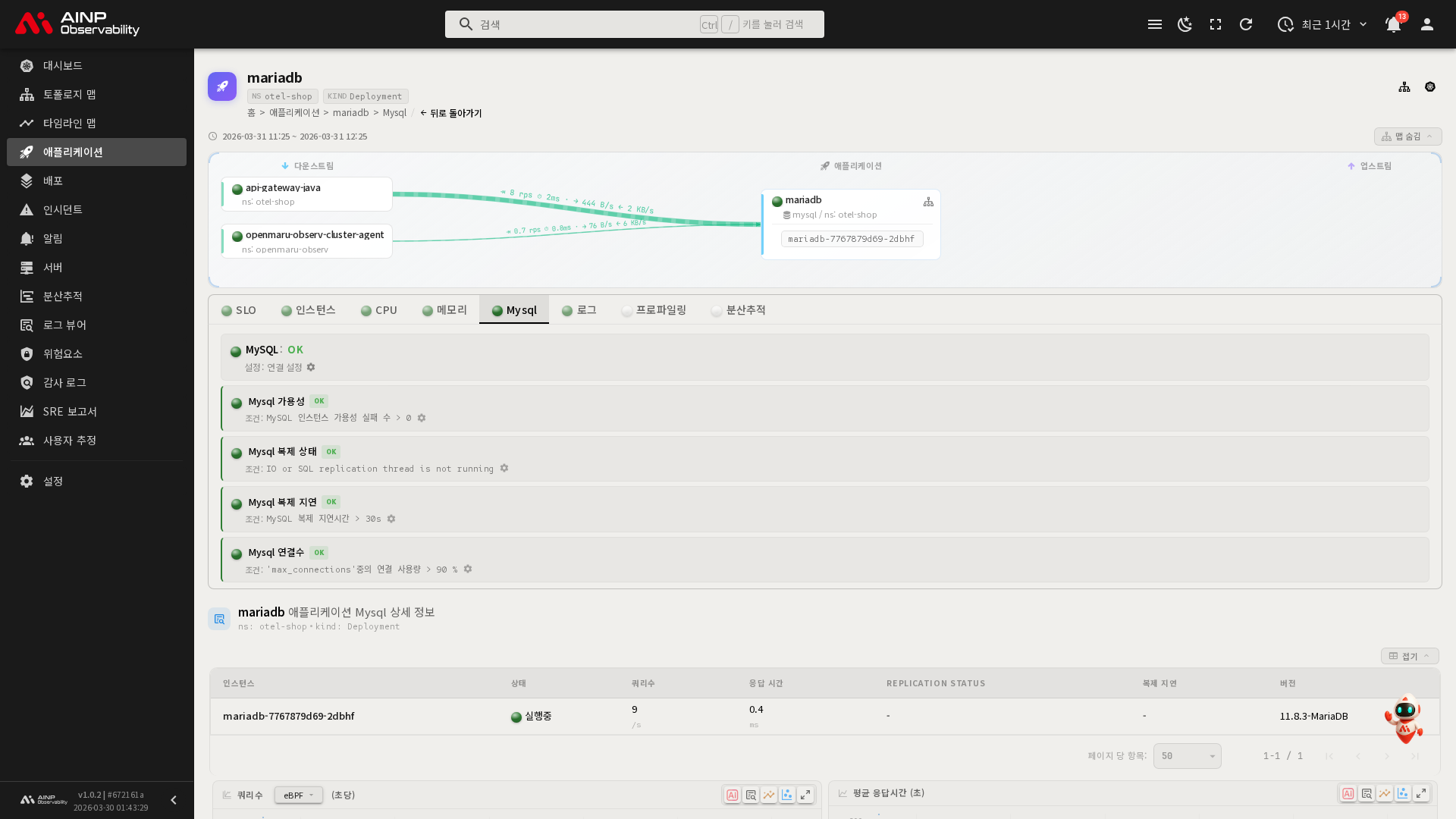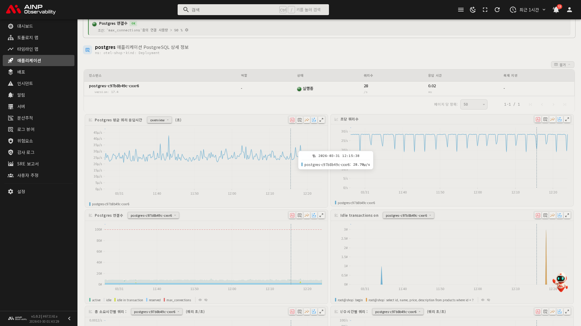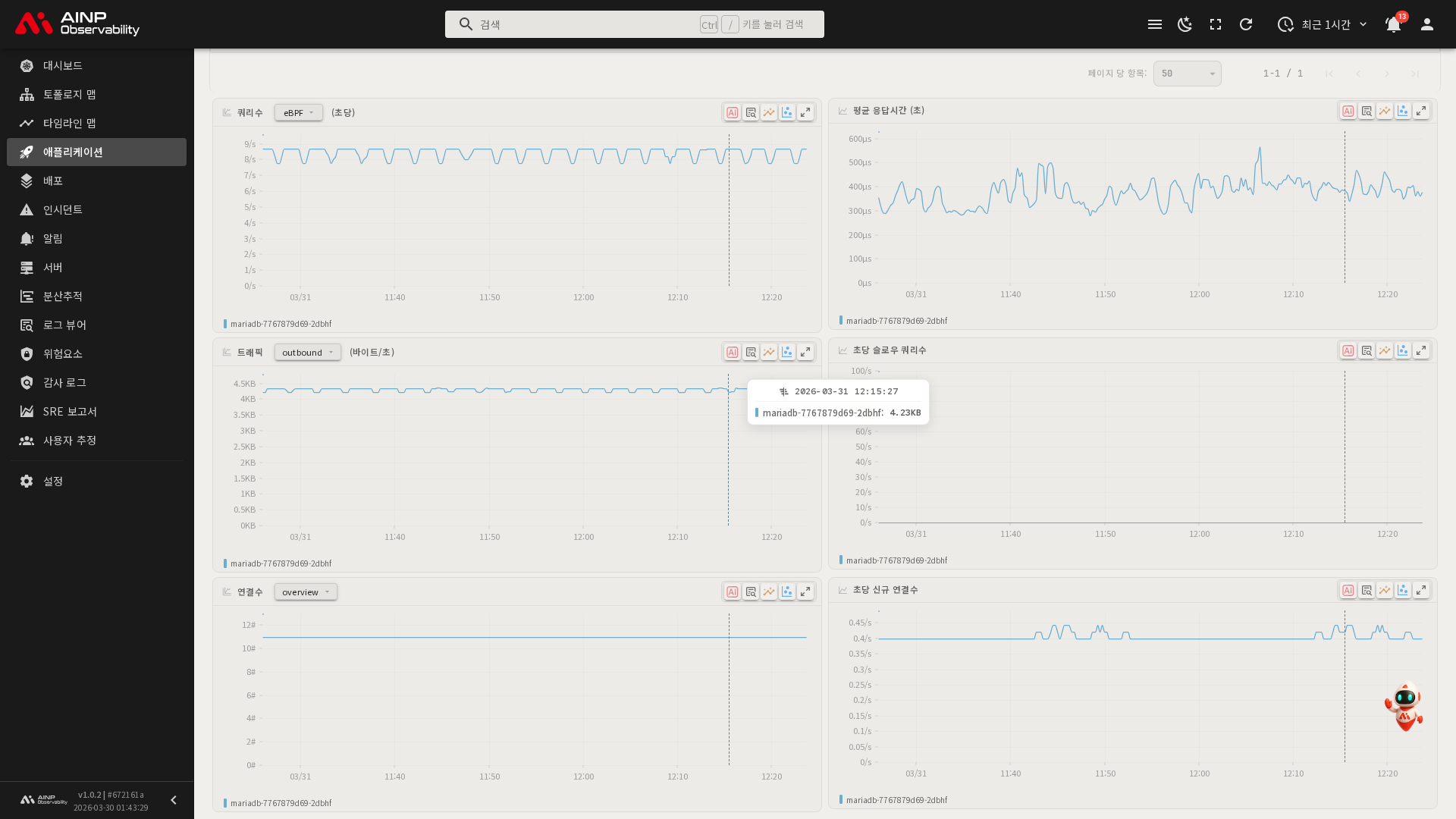 애플리케이션 상세 페이지에서 에이전트가 데이터베이스나 미들웨어 연동을 감지하면 해당 리포트 탭이 자동으로 추가됩니다. 별도의 설정 없이 자동으로 수집됩니다.