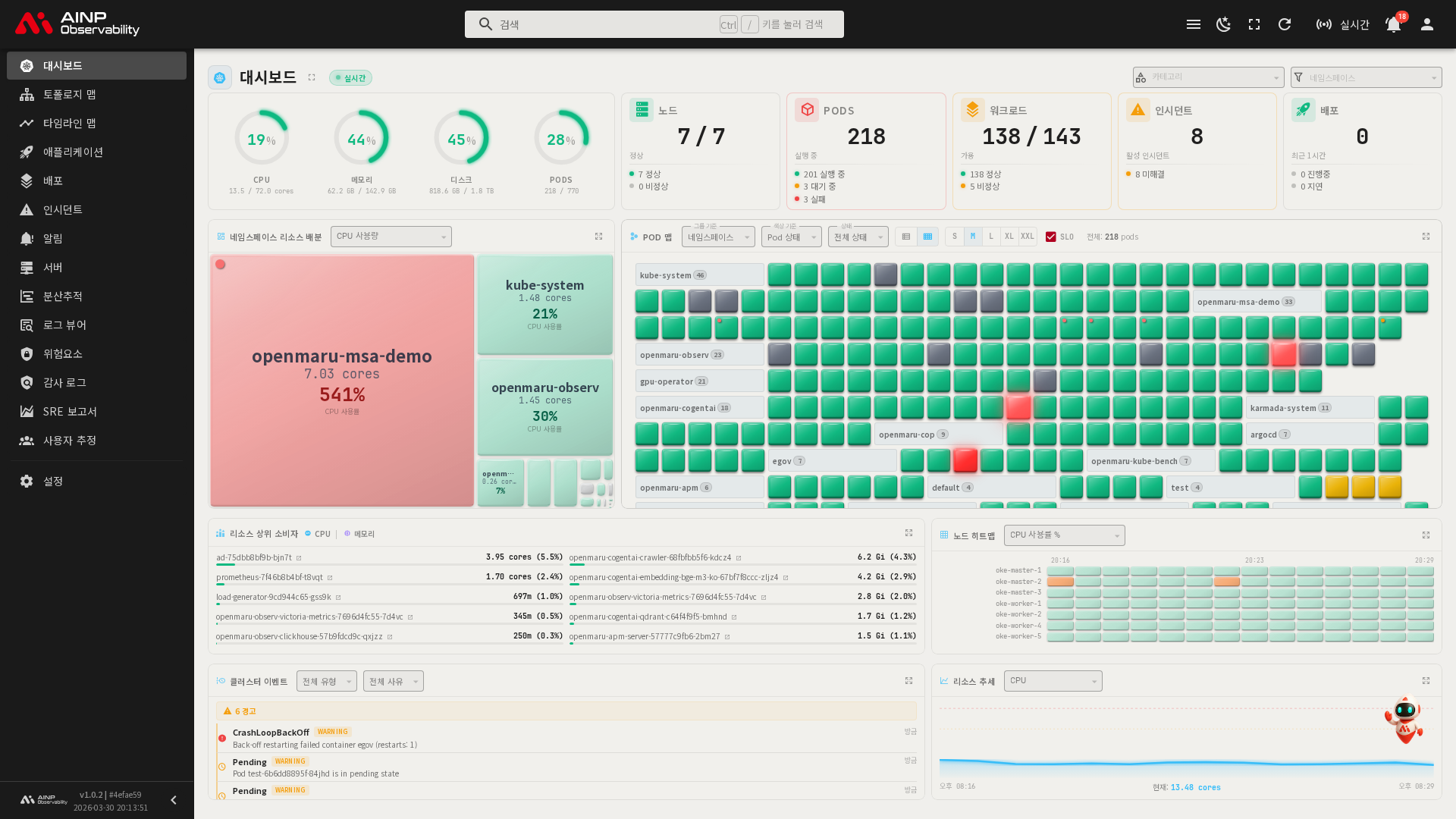 | 클러스터 이벤트 | 최근 발생한 Kubernetes 이벤트 목록 |