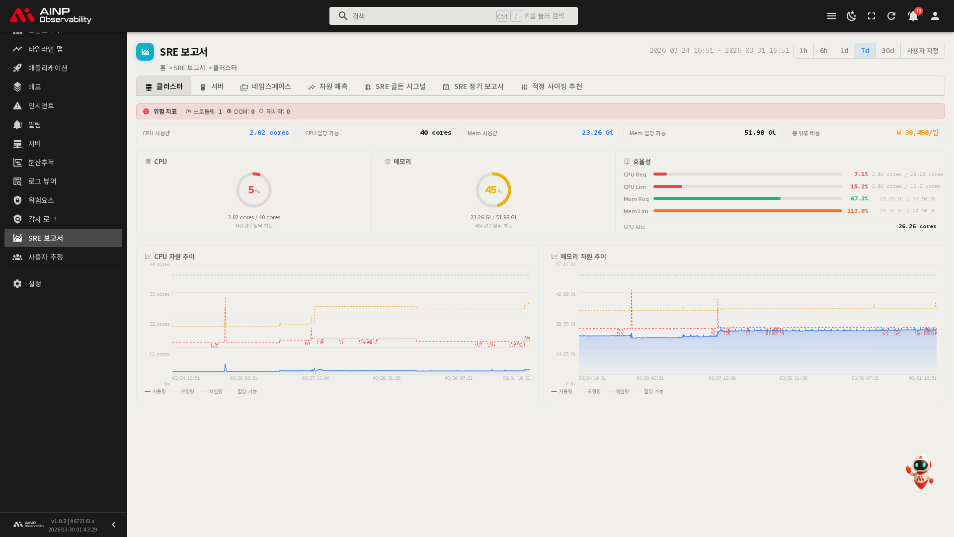 클러스터 탭에서는 클러스터 전체의 CPU, 메모리 사용 현황과 위험 지표를 한눈에 확인할 수 있습니다.