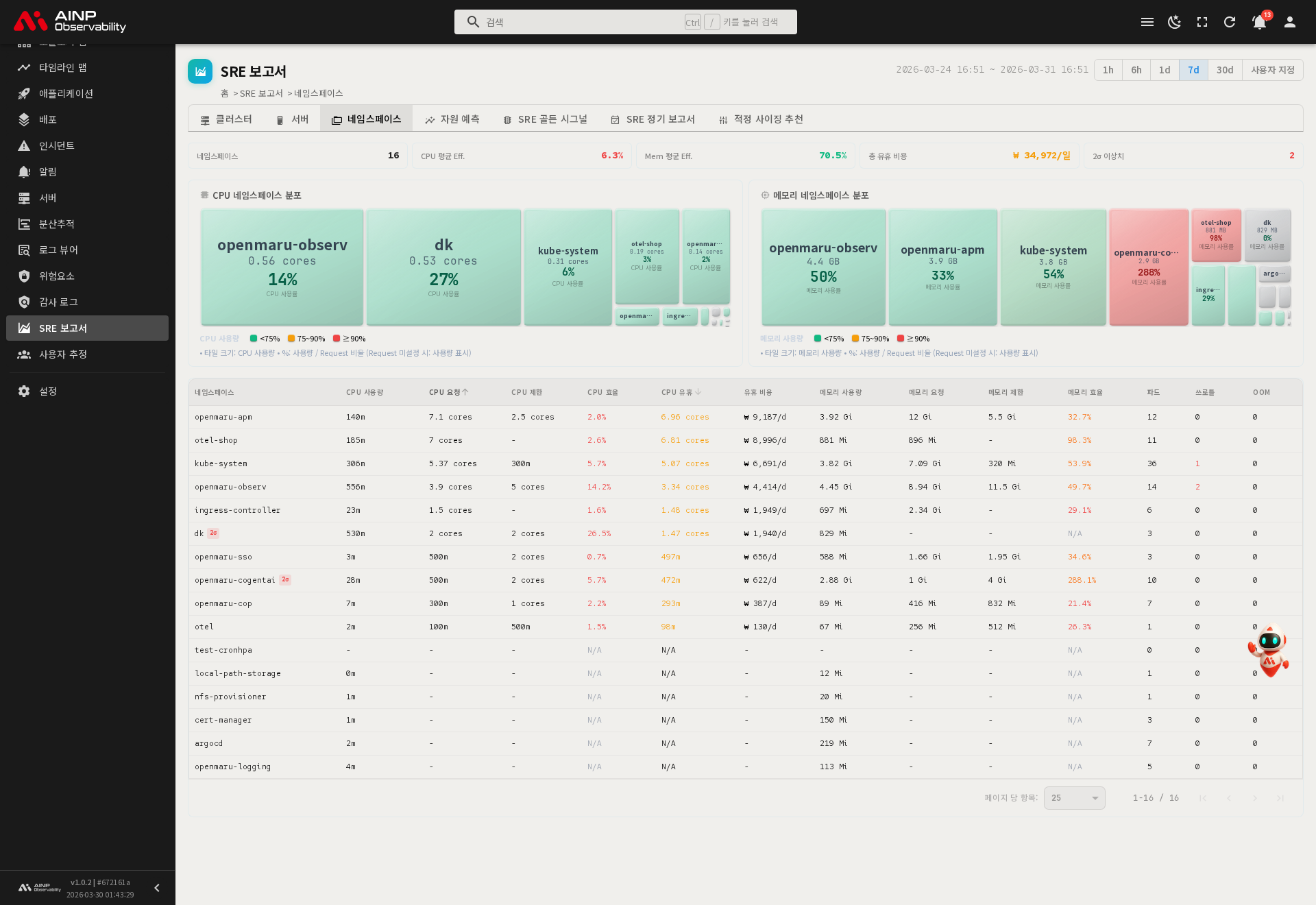 | 네임스페이스 | 네임스페이스별 자원 분포, 효율성, 유휴 비용 |