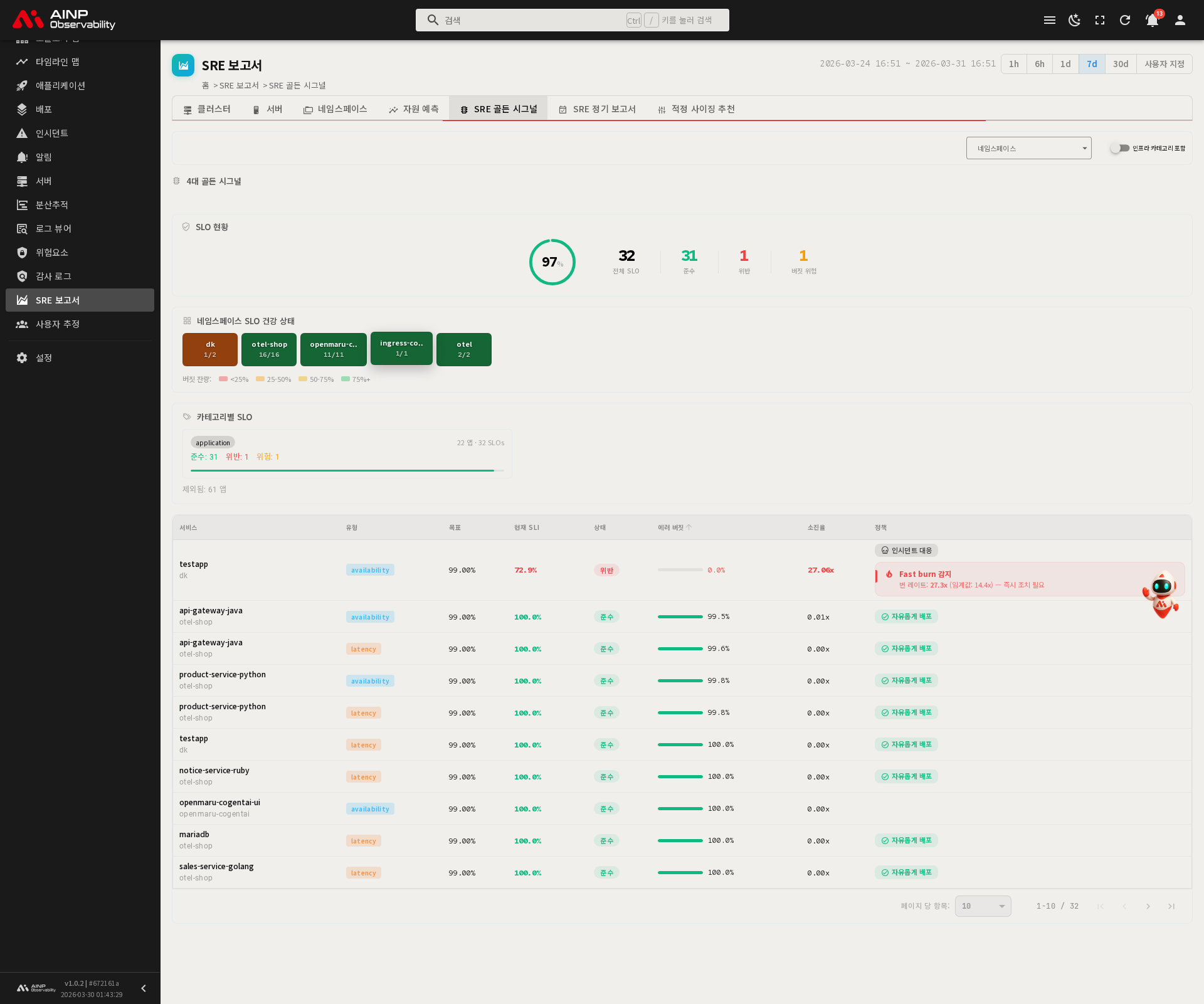4대 골든 시그널 아래에 SLO 현황 섹션이 표시됩니다.