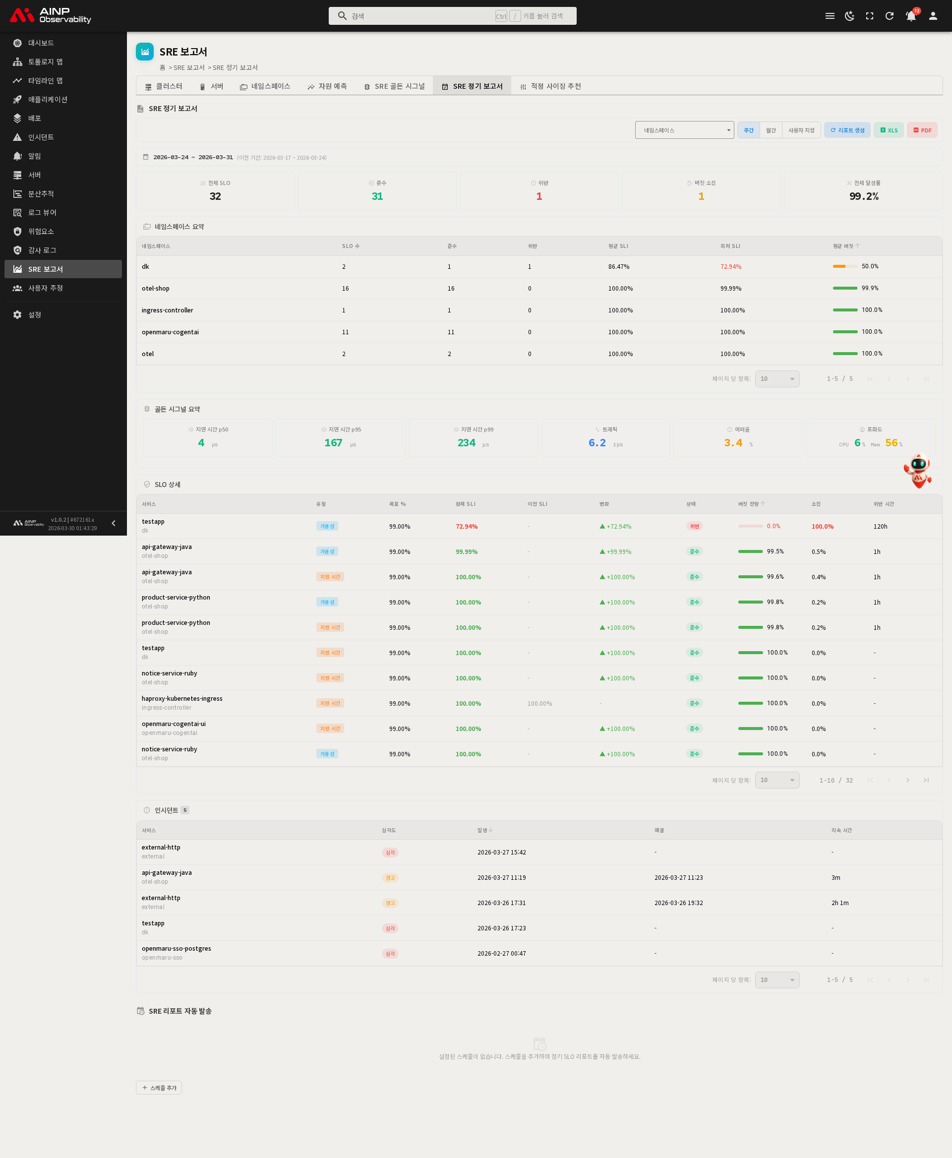 | SLO 상세 | 서비스별 현재/이전 SLI, 변화량, 버짓 잔량, 위반 시간, 소진율 |