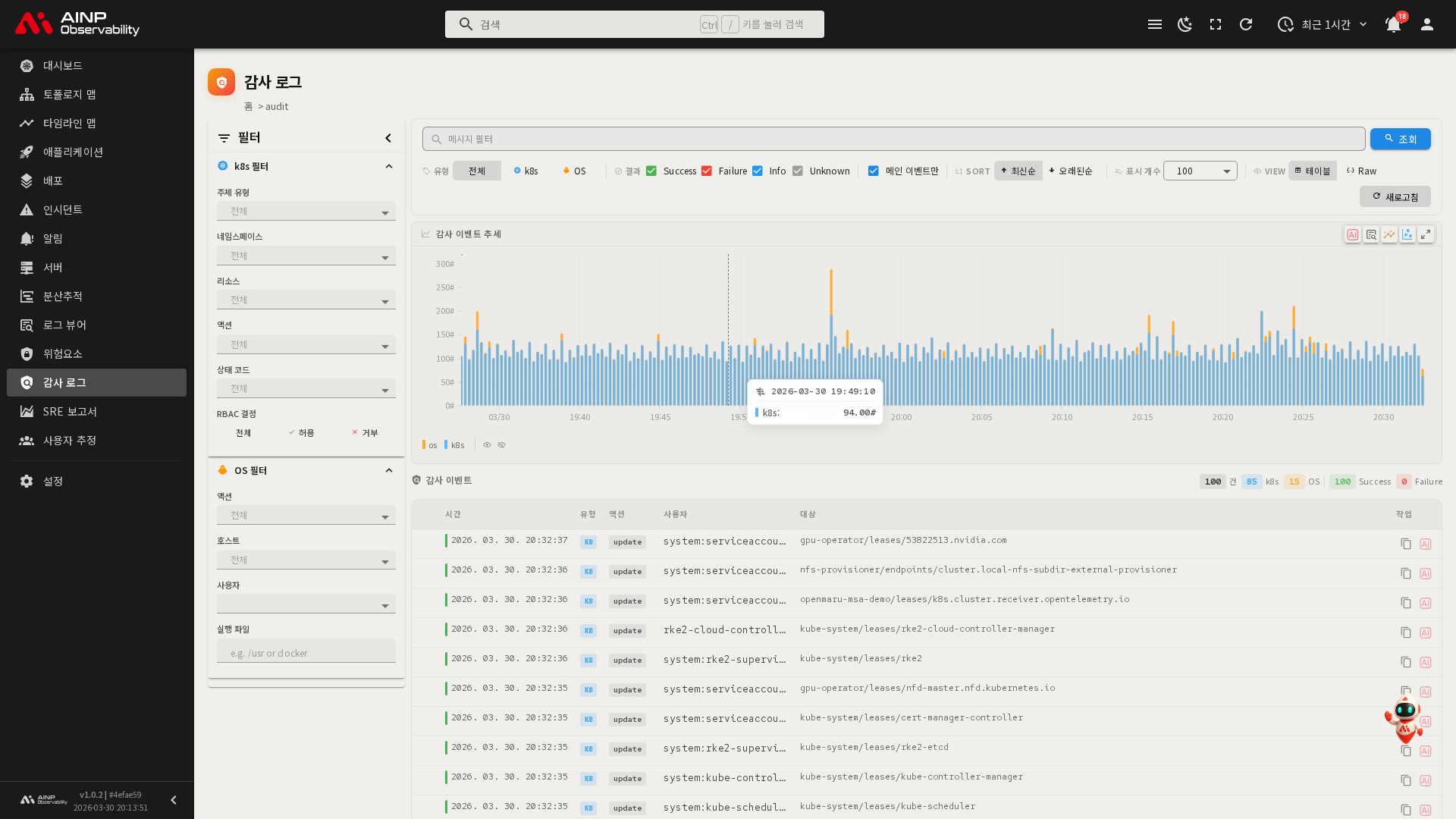 감사 로그(Audit Log) 화면에서는 Kubernetes API 서버와 서버 운영체제에서 발생한 감사 이벤트를 조회할 수 있습니다. 누가, 언제, 어떤 리소스에, 어떤 작업을 수행했는지 추적할 수 있어 보안 감사와 변경 이력 관리에 활용합니다.