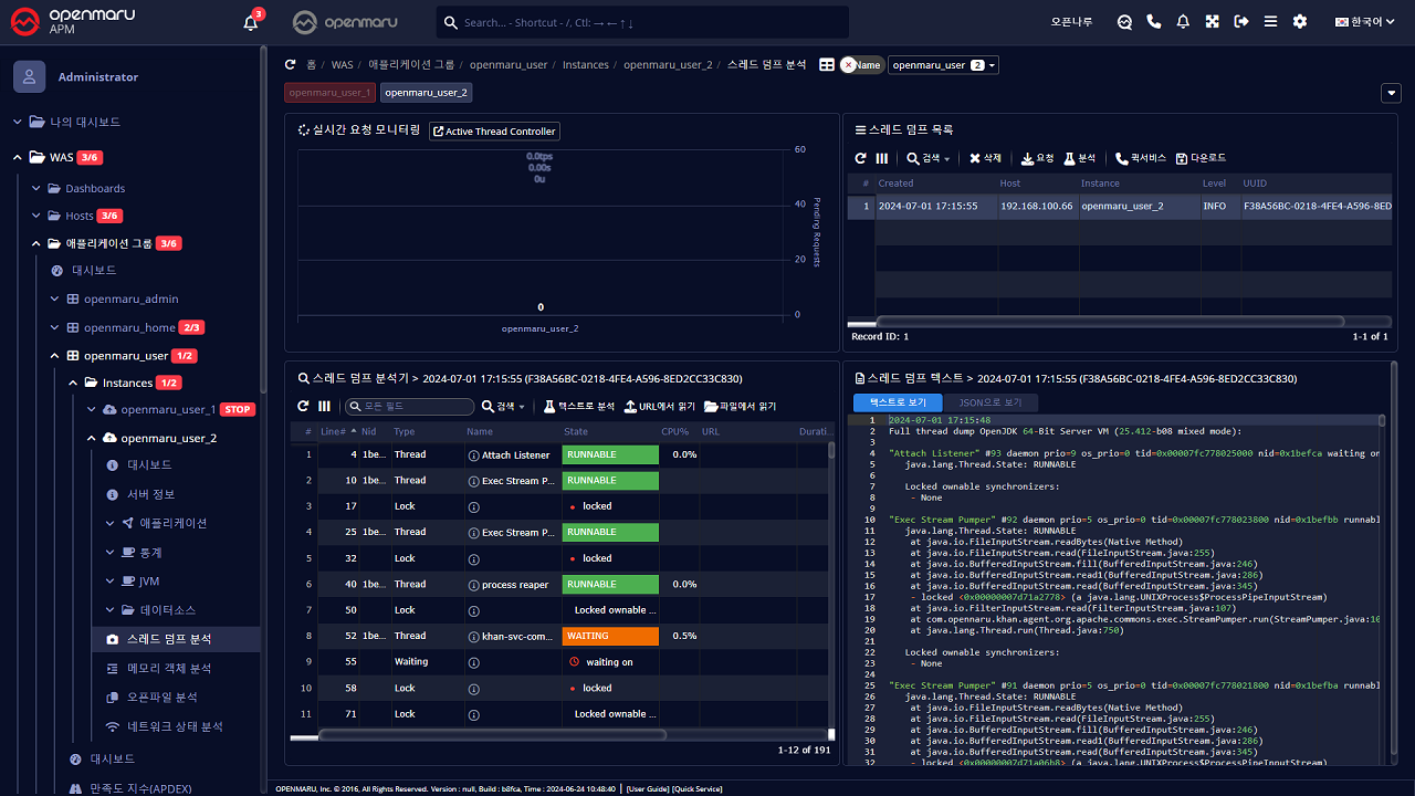 위와 같이 빌드한 이미지를 사용하여 애플리케이션을 배포하면 OPENMARU APM 모니터링 서버에서 애플리케이션에 대한 상세한 모니터링이 가능하다.