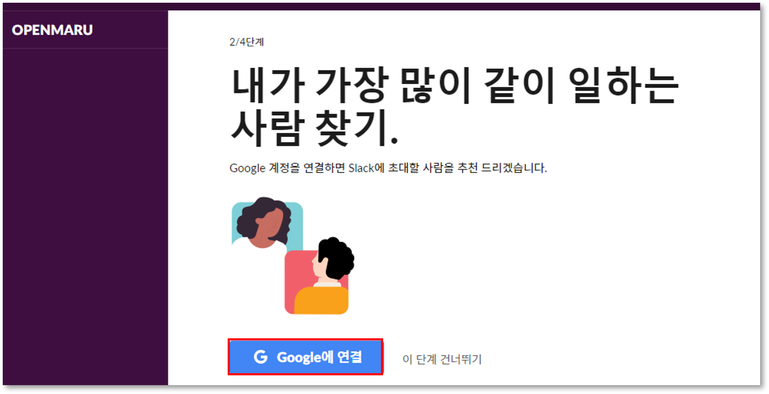 2단계에서는 'Google에 연결’하기를 통해 Slack에 초대할 사람을 추천받을 수 있다.