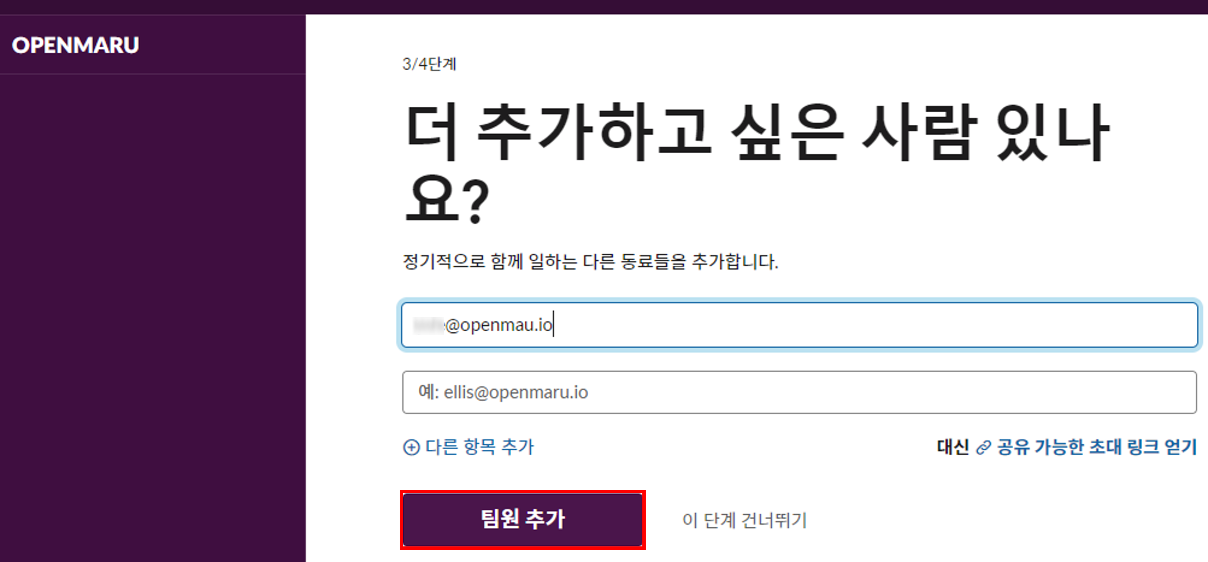 3단계에서 팀에 초대할 사용자 이메일을 입력할 수가 있다. 4단계까지 정보를 입력한다.