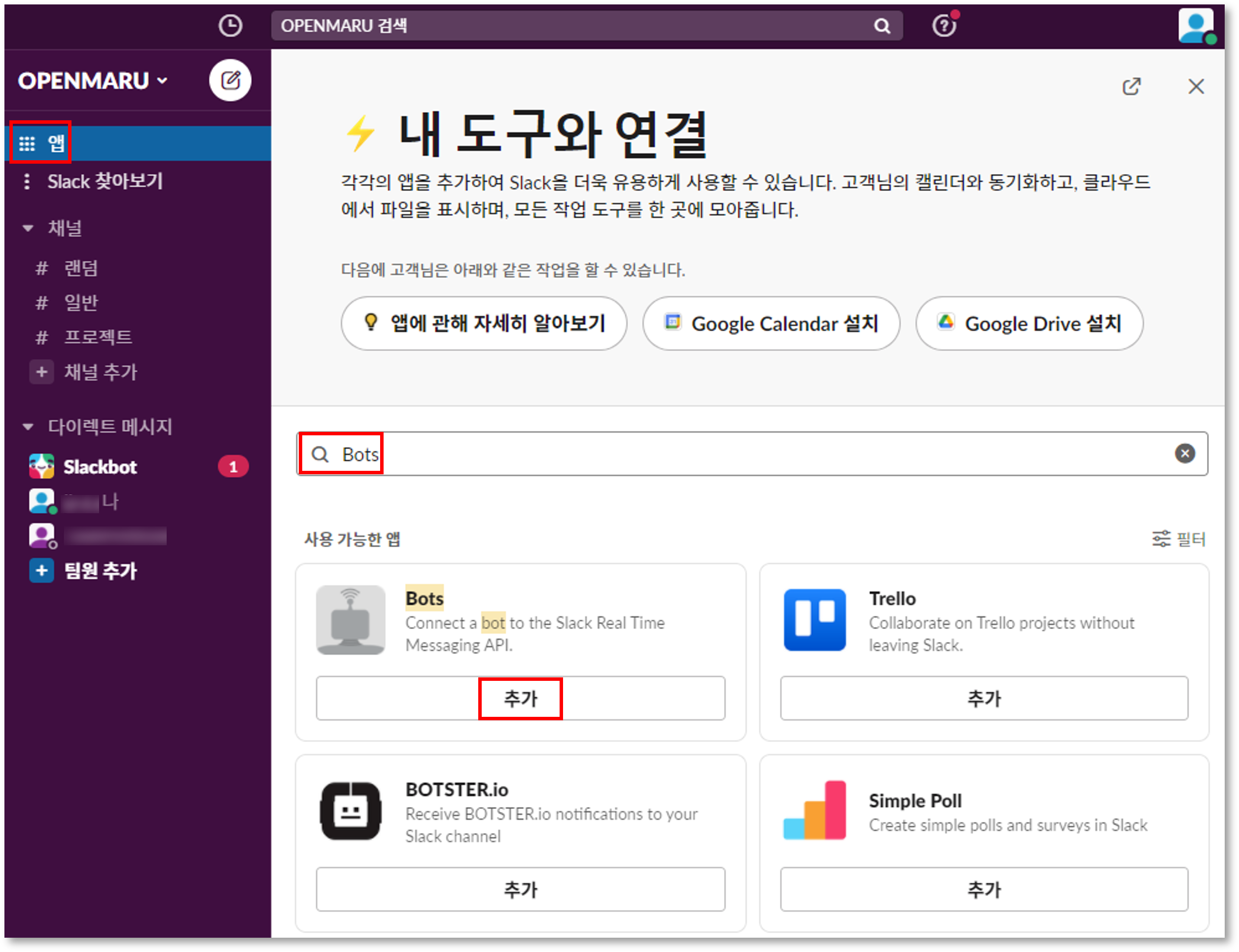 앱에서 'Bots' 검색하여 Slack에 추가한다.