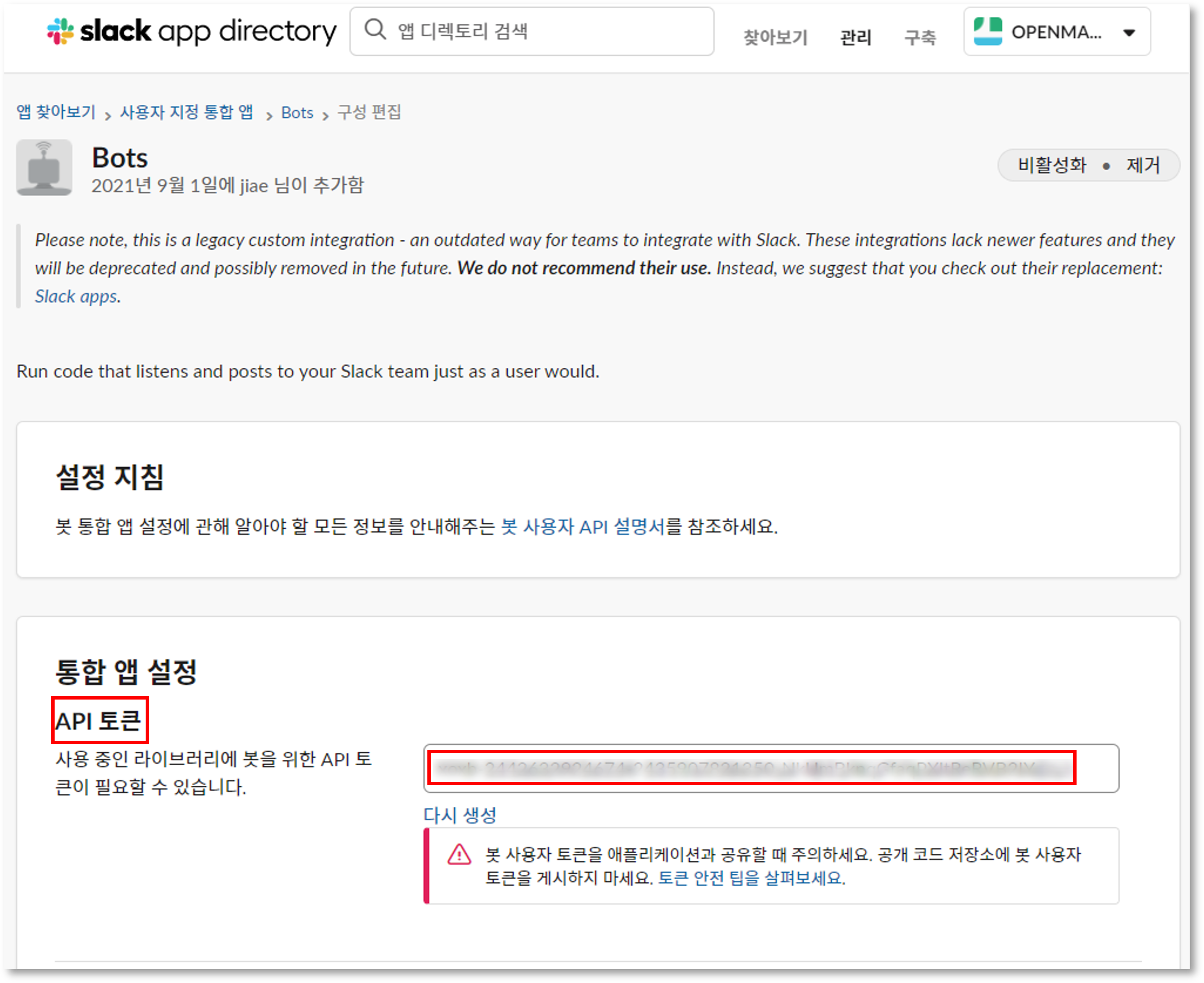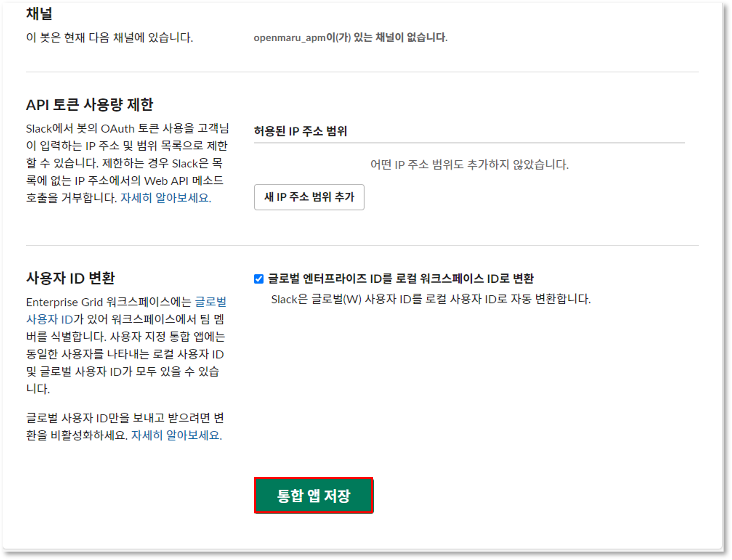 API Token 확인 후 통합 앱 저장 버튼을 클릭하여 저장한다.