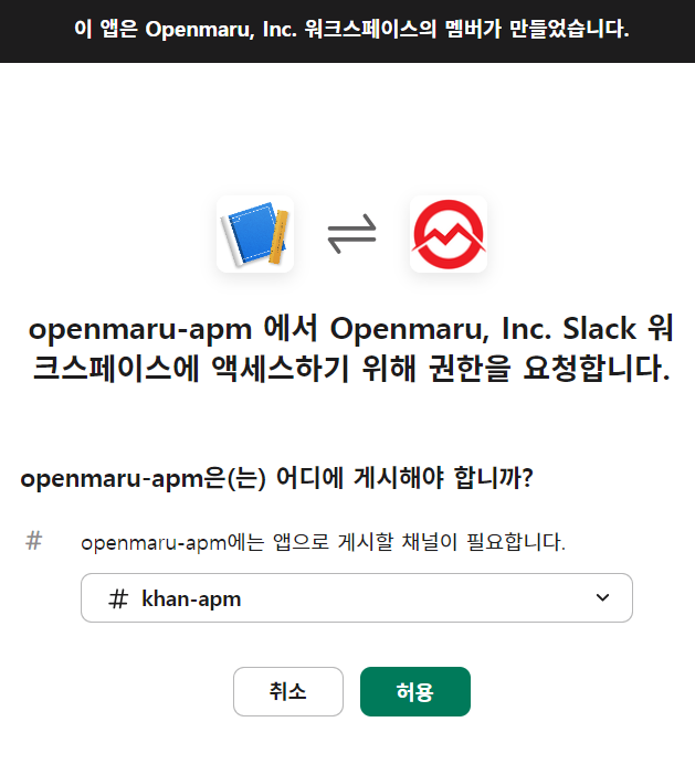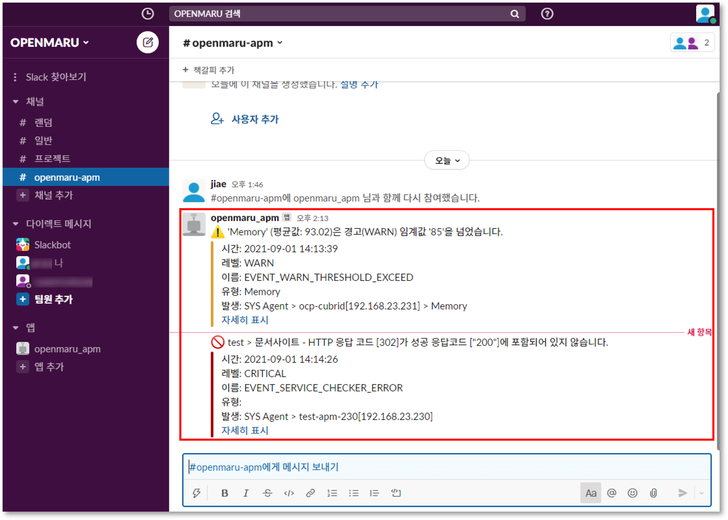 이제 APM 서버를 재시작하면, Slack의 openmaru-apm 채널에 연결한 Webhook 또는 @openmaru_apm 봇(bot)을 통해 APM 의 이벤트들을 확인할 수 있다.