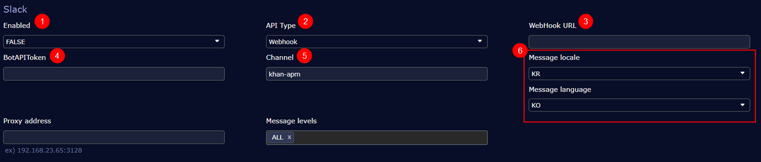 | ① 사용여부 | slack Integration 을 사용할 것인지를 설정한다. 이벤트 알림을 받고자 할 경우, "TRUE"로 설정한다. |