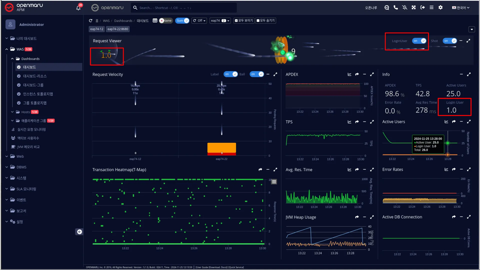 실시간 로그인 유저 정보도 대시보드 Info 영역에 표시하고 Request Viewer에 기본으로 출 력할지 여부를 설정한다.