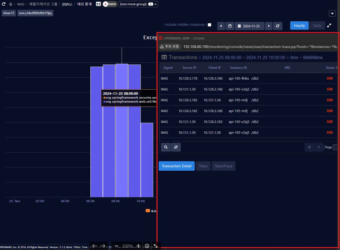 시간 별로 오류 수를 막대그래프로 나타내며, mouse over 시 Exception 과 개수를 표시한다. 막대그래프를 클릭 시 트랜잭션 detail 을 확인할 수 있다.