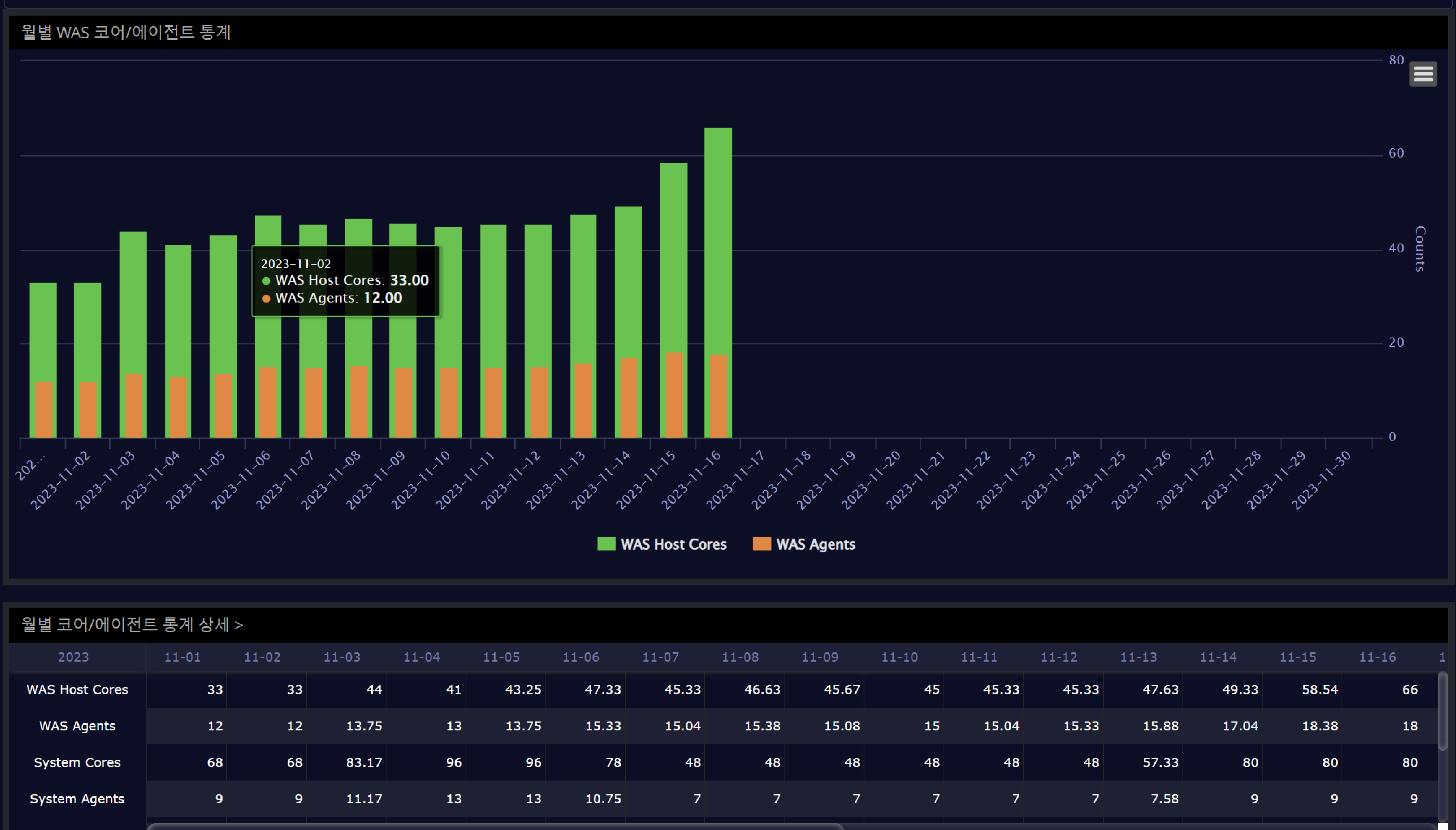 현재 기동중인 WAS 에이전트 갯수 / 현재까지 기동된 WAS 에이전트 갯수 (저장 기간동안)