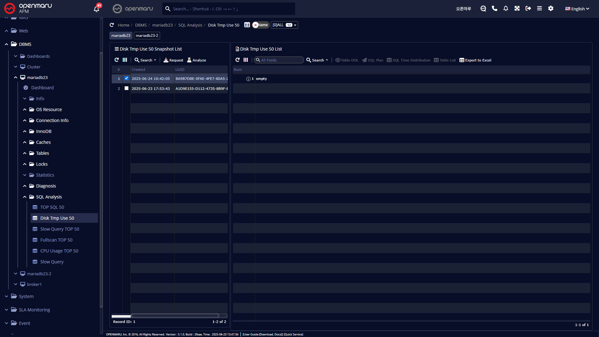 Disk Tmp Use 50은 MySQL 데이터베이스에서 디스크 임시 테이블을 가장 많이 사용하는 상위 50개 쿼리를 보여줍니다. 디스크 임시 테이블은 메모리 부족으로 인해 디스크에 생성되는 임시 테이블로, 성능에 심각한 영향을 미치므로 정기적인 모니터링과 최적화가 필요합니다.