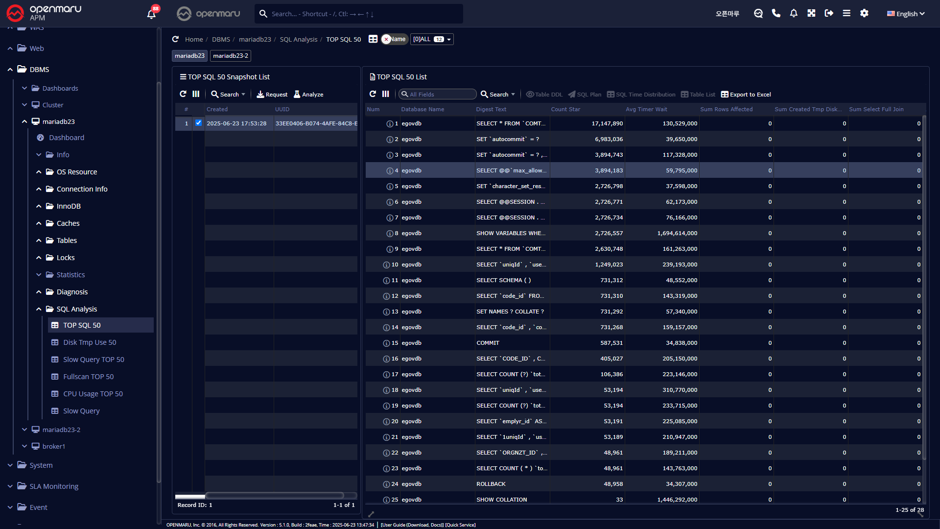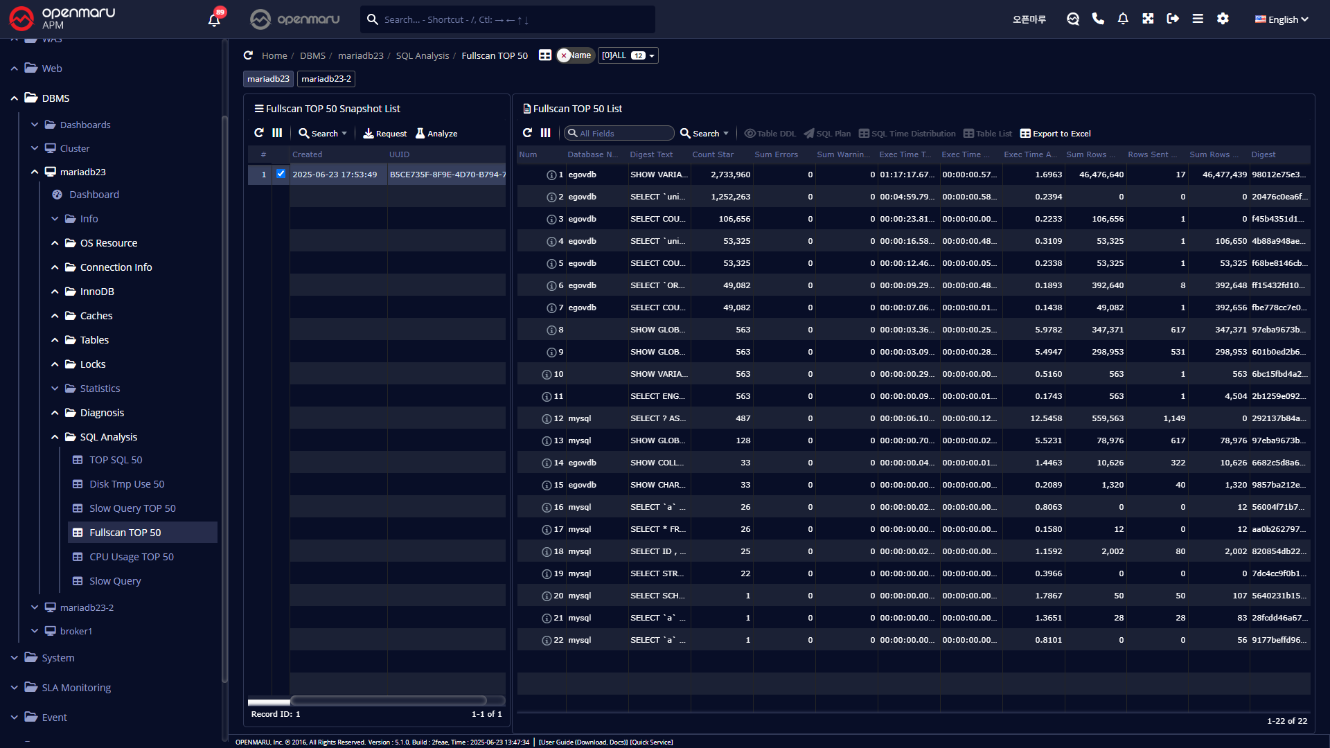 TOP SQL 50은 MySQL 데이터베이스에서 실행된 쿼리 중 성능 지표를 기준으로 상위 50개를 선별하여 보여줍니다. 이를 통해 가장 많은 리소스를 사용하거나 성능에 영향을 미치는 쿼리를 식별하고 최적화할 수 있습니다.