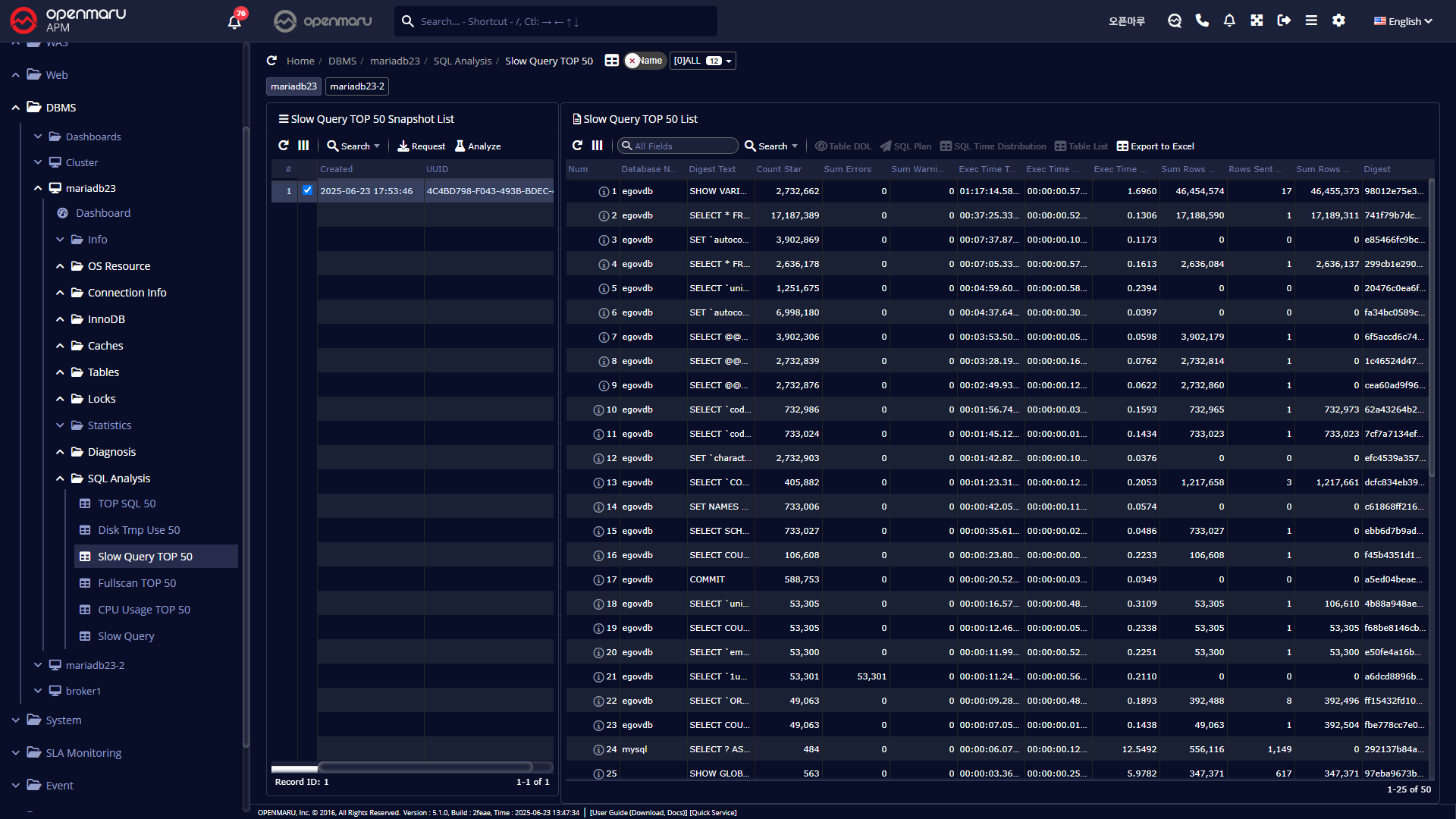 Slow Query Top 50은 MySQL 데이터베이스에서 실행 시간이 긴 상위 50개 쿼리를 보여줍니다. 느린 쿼리는 전체 데이터베이스 성능에 심각한 영향을 미치므로 정기적인 모니터링과 최적화가 필요합니다.