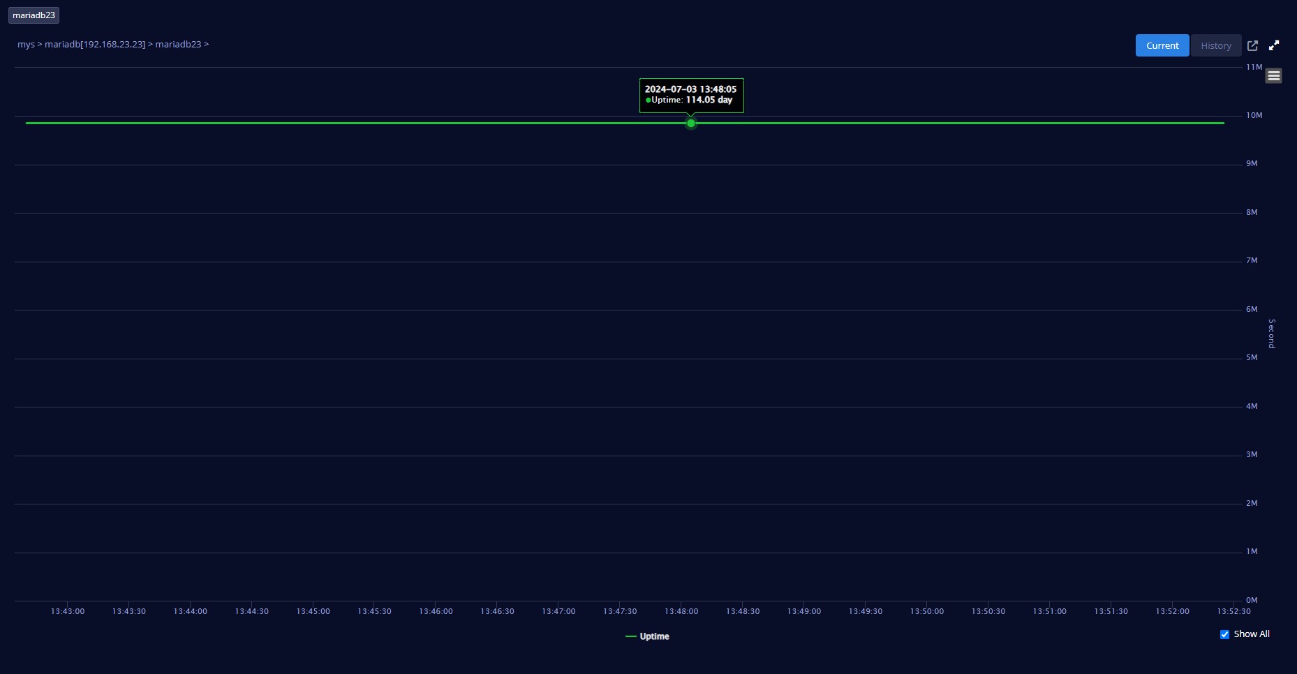 DBMS 가 기동된 후 지난 시간을 표시한다.