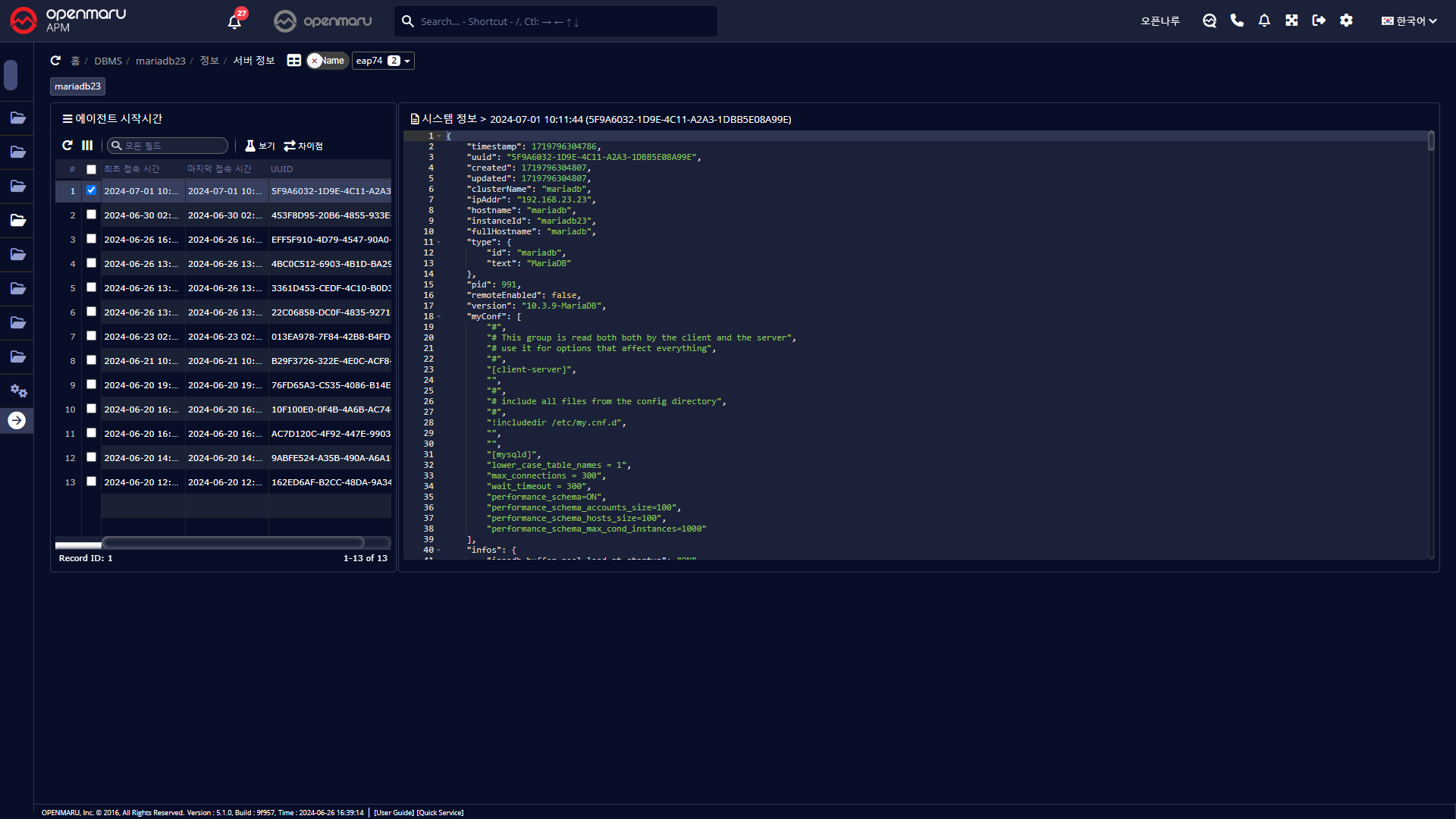 DBMS 를 실행할 때 버전, 서버 설정값 및 Agent 의 주요 설정값 등을 확인해 볼 수 있다.