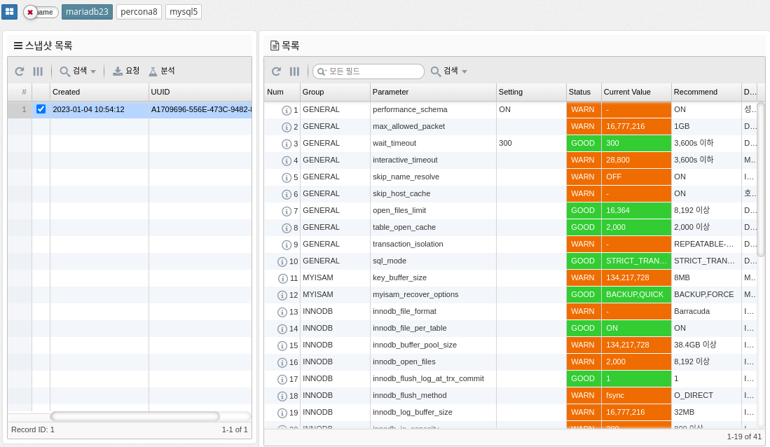 DBMS 의 현재 파라미터 설정값과 추천값을 확인한다.