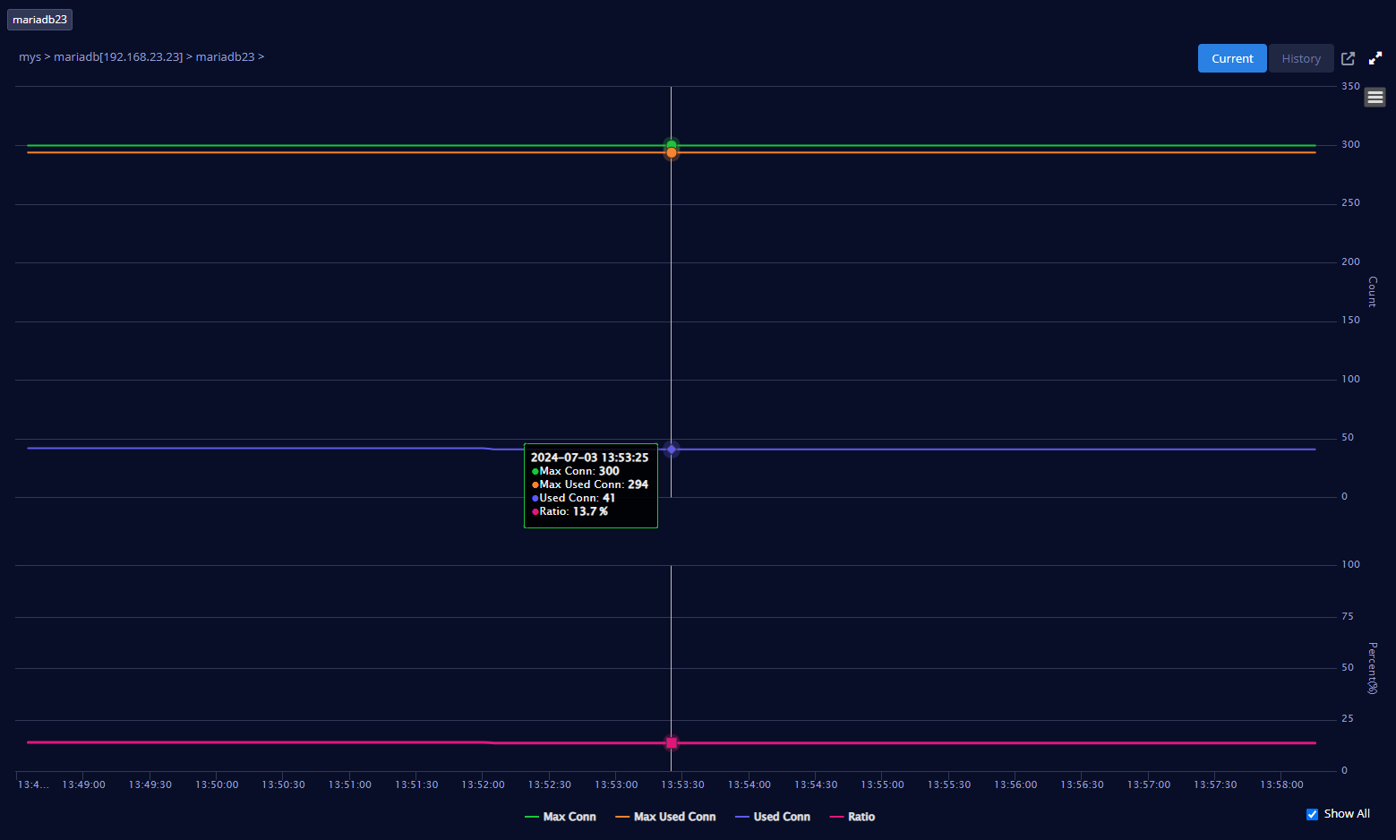 Ratio: MySQL 서버에 대한 현재 연결률을 나타내는 변수입니다. 연결률은 Used Conn / Max Conn 로 계산됩니다.