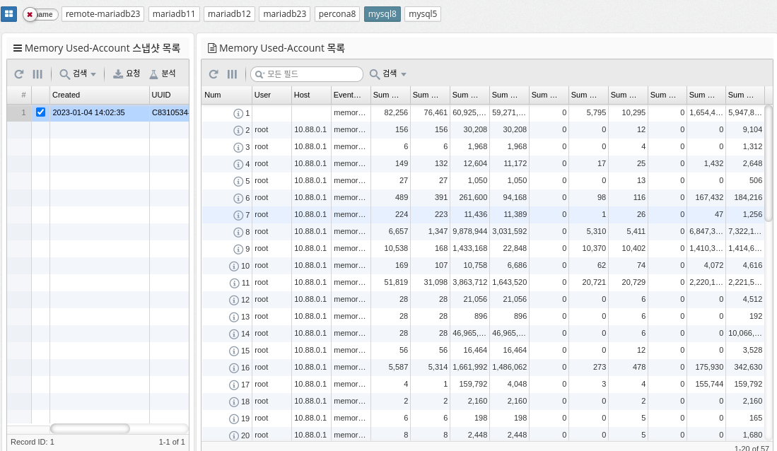 쿼리 출력은 각 계정에서 사용한 총 메모리 요약을 이벤트 이름별로 분류하여 제공합니다. 이 정보는 데이터베이스 쿼리 최적화, 저장된 데이터 양 감소 또는 추가 리소스 추가와 같이 성능을 개선할 수 있는 영역을 식별하는 데 사용할 수 있습니다.