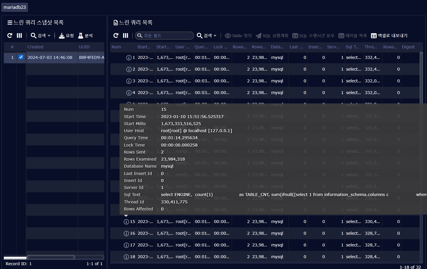 slow_log 테이블은 시작 시간, 실행 시간, SQL 문 및 처리된 행 수와 같은 각 느린 쿼리에 대한 정보를 저장합니다. 이 정보를 사용하여 실행하는 데 너무 오래 걸리는 쿼리와 성능 향상을 위해 변경해야 하는 사항을 식별할 수 있습니다.