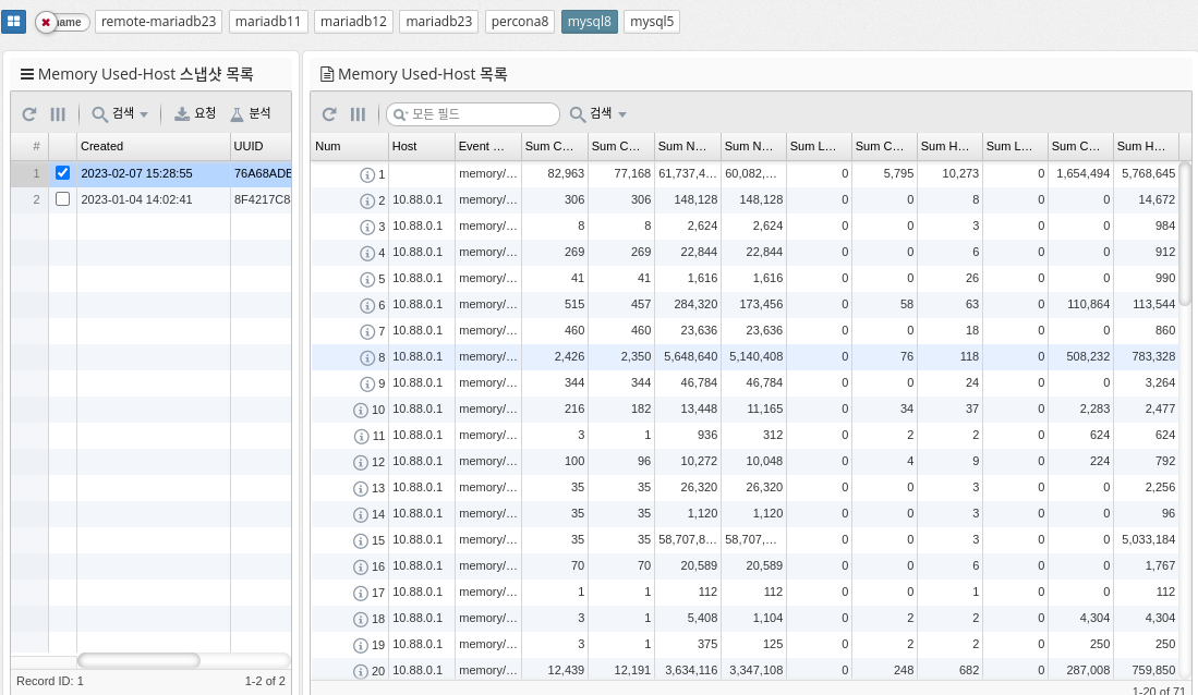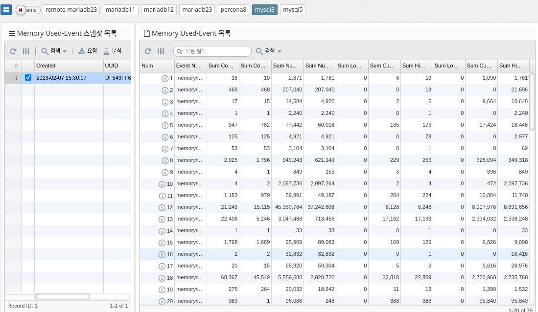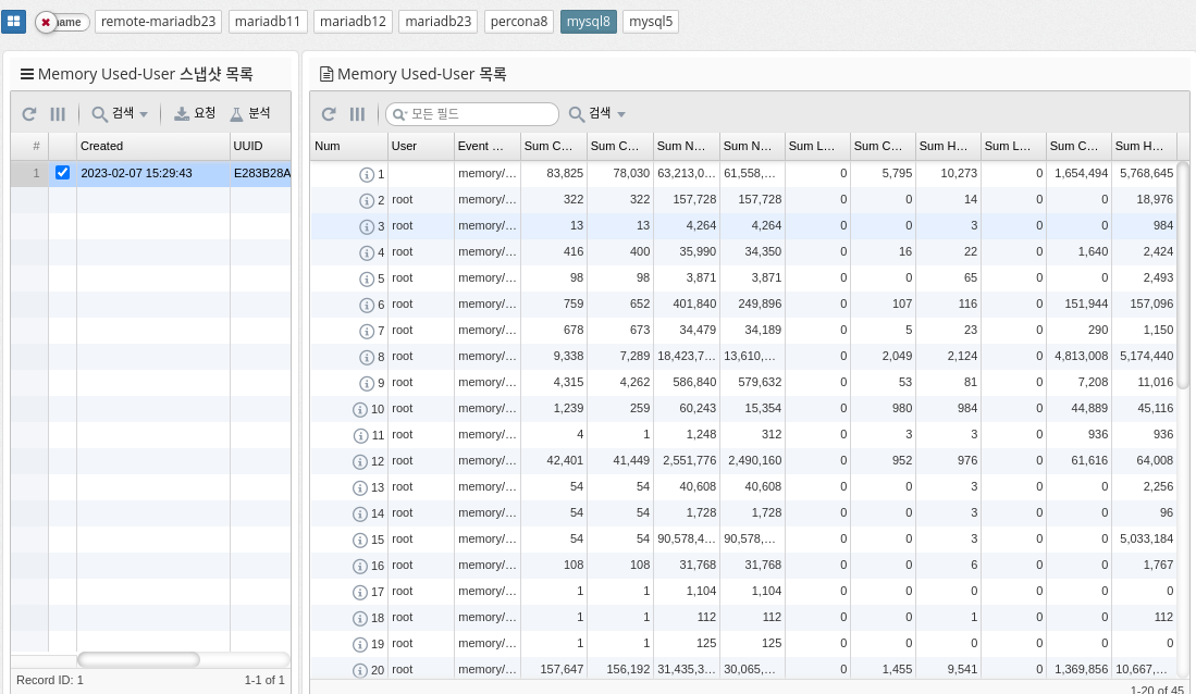 쿼리 출력은 각 계정에서 사용한 총 메모리 요약을 이벤트 이름별로 분류하여 제공합니다. 이 정보는 데이터베이스 쿼리 최적화, 저장된 데이터 양 감소 또는 추가 리소스 추가와 같이 성능을 개선할 수 있는 영역을 식별하는 데 사용할 수 있습니다.