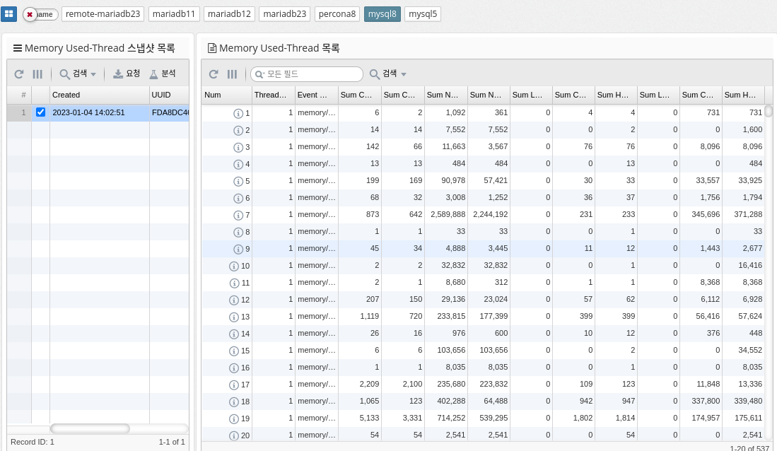 이 정보는 데이터베이스 관리자가 메모리 사용량을 최적화해야 하거나 리소스를 다르게 할당해야 하는 영역을 식별하는 데 유용할 수 있습니다. "performance_schema.memory_summary_by_thread_by_event_name" 테이블과 같은 관련 데이터베이스 테이블 및 열에 대해 group by 절과 함께 SELECT 문을 실행하여 쿼리를 실행할 수 있습니다.