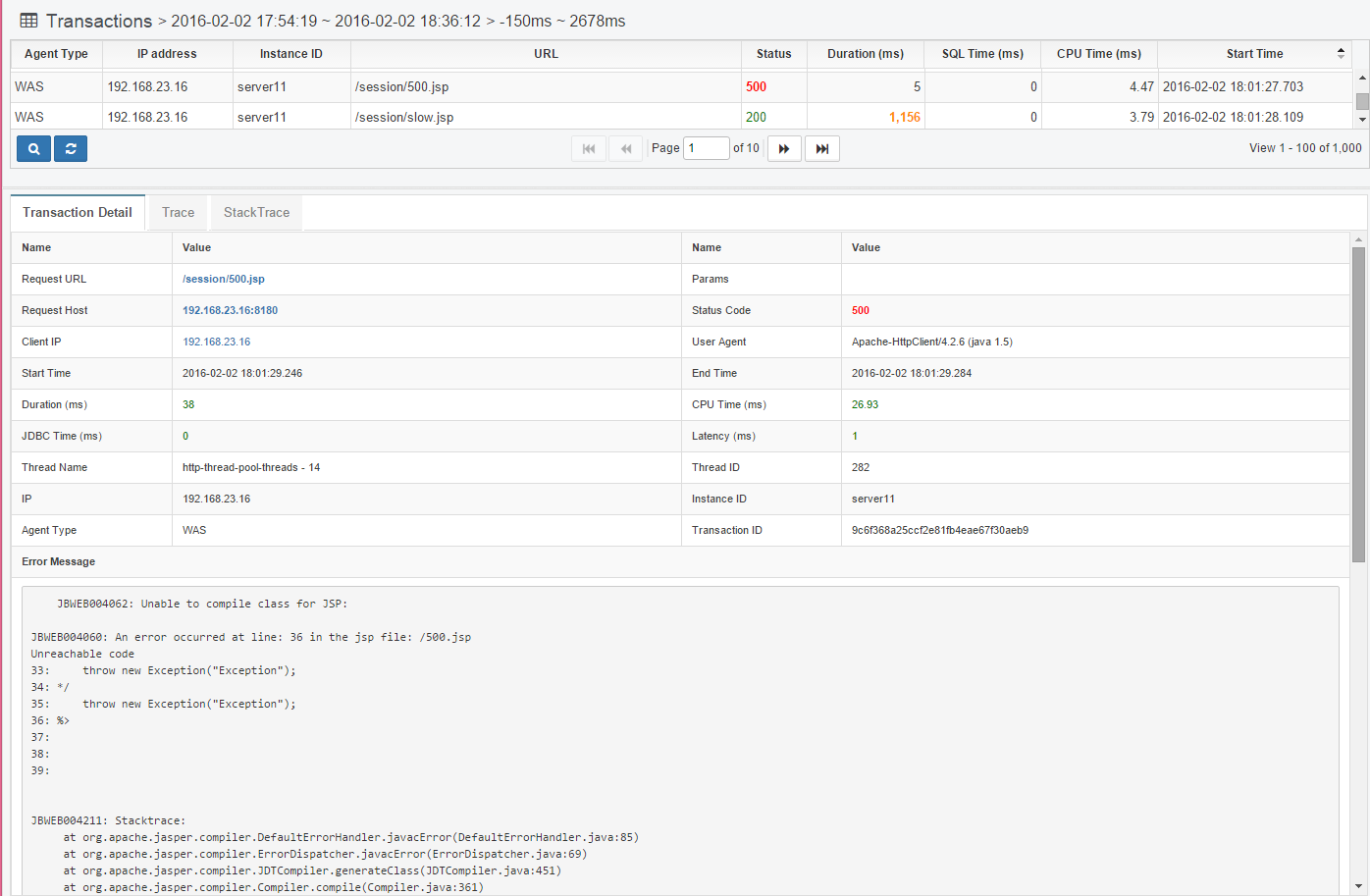 HTTP Status Code 40x, 50x오류 정보를 모두 수집한다. 500 오류 중에서 JSP 컴파일 오류와 같은 오류는 아래와 같이 오류 메시지를 수집하여 표시한다.