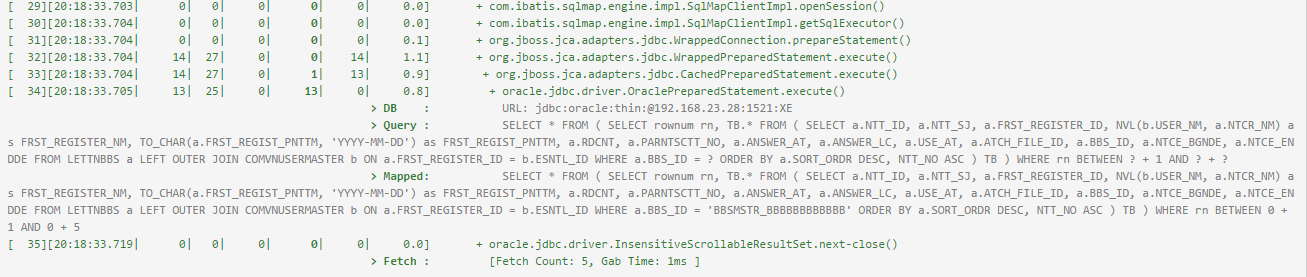 위와 같이 SQL쿼리의 수행시간이 오래 걸리면(WAS Agent에서 설정), 해당 쿼리를 실행한 애플리케이션의 위치를 파악할 수 있도록 Stack Trace를 출력한다.