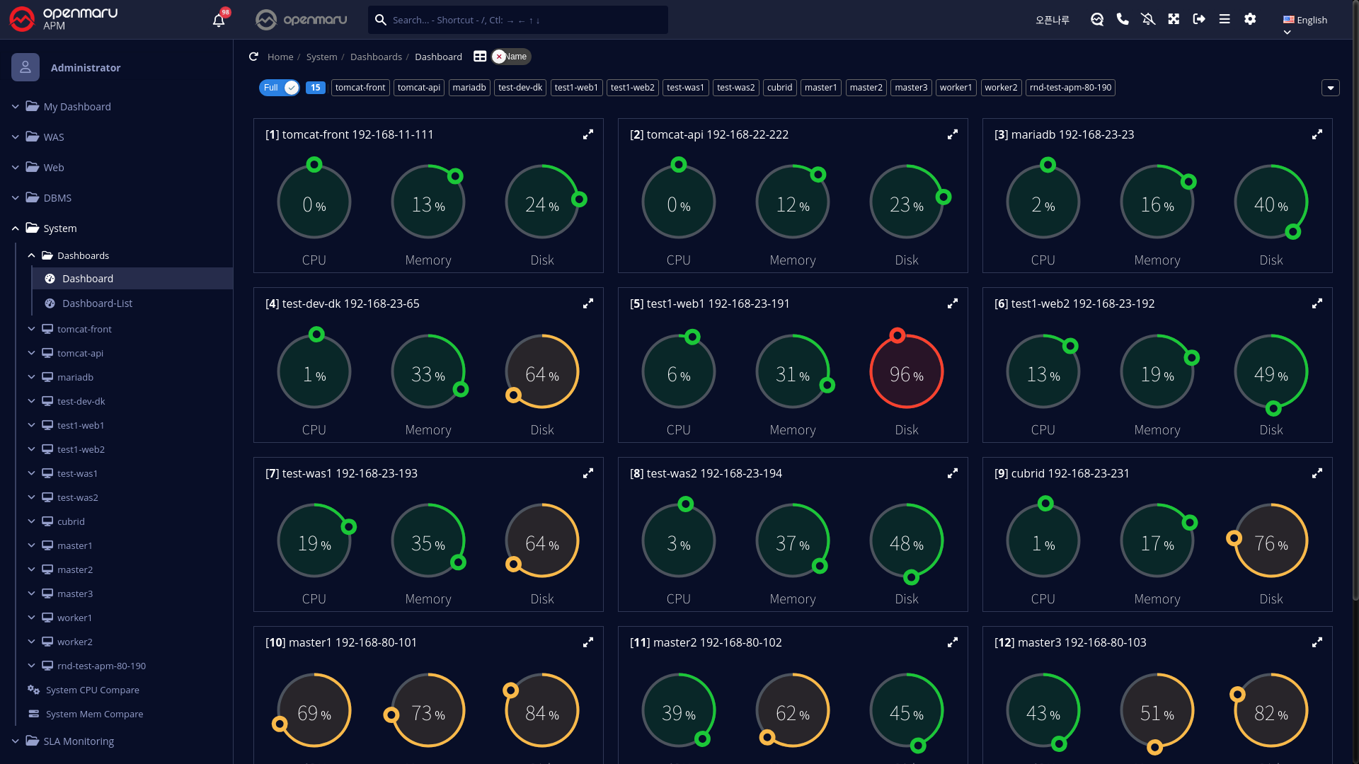 WAS의 대시보드를 구성하는 차트들은 다음 그림과 같다. 대시보드에는 업무 애플리케이션 단위로 묶어 표시한다.