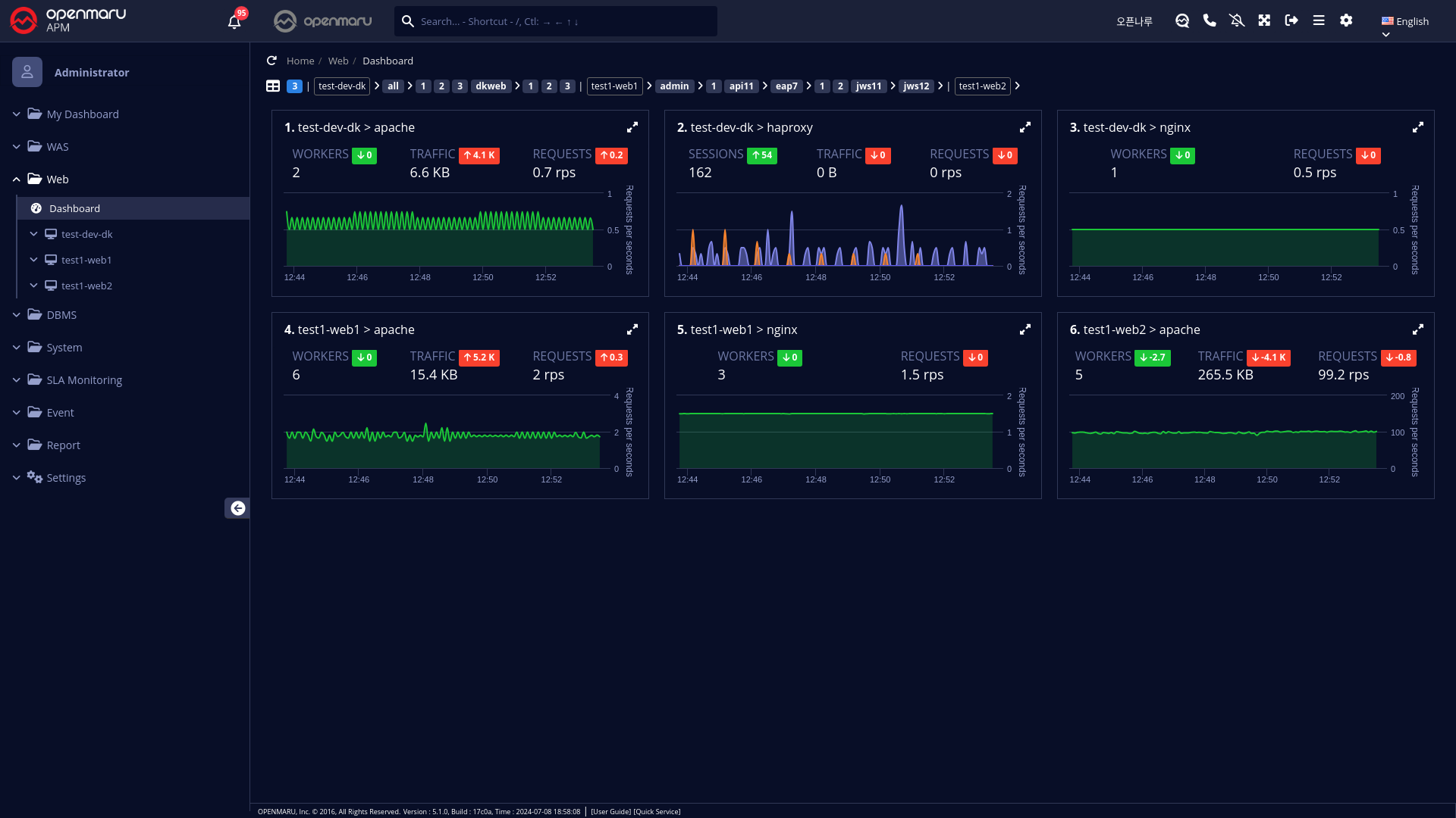 업무 시스템에서 사용하는 개별 인스턴스 현재 실행중인 Request들을 볼 수 있는 Request Velocity Chart와 업무 시스템 전체 에 대한, Transaction Heatmap(T-Map), 사용자 만족도 지수(APDEX), TPS(Transaction Per Second), Active Users, Average Response Time, Error Rate에 대한 차트와 해당 정보를 텍스트로 출력하는 Information Widget이 표시된다.