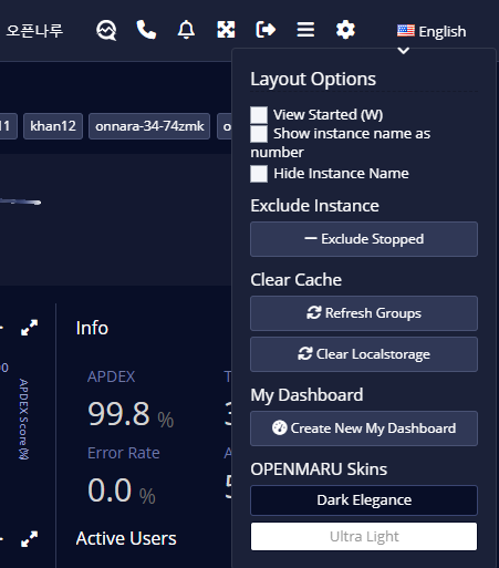 - 대시보드 업무 Refresh : WAS 대시보드에만 표시되며, 선택한 시간 단위(1분~10분)로 업무별로 대시보드를 화면을 갱신하여 표시한다.