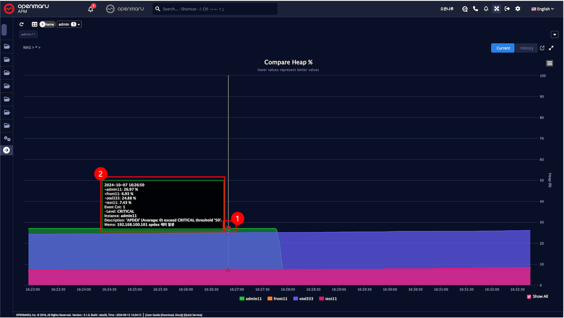 ① 메뉴영역 : WAS, WEB, SYS 하위로 해당 정보를 찾아 볼 수 있는 메뉴를 표시하는 영역