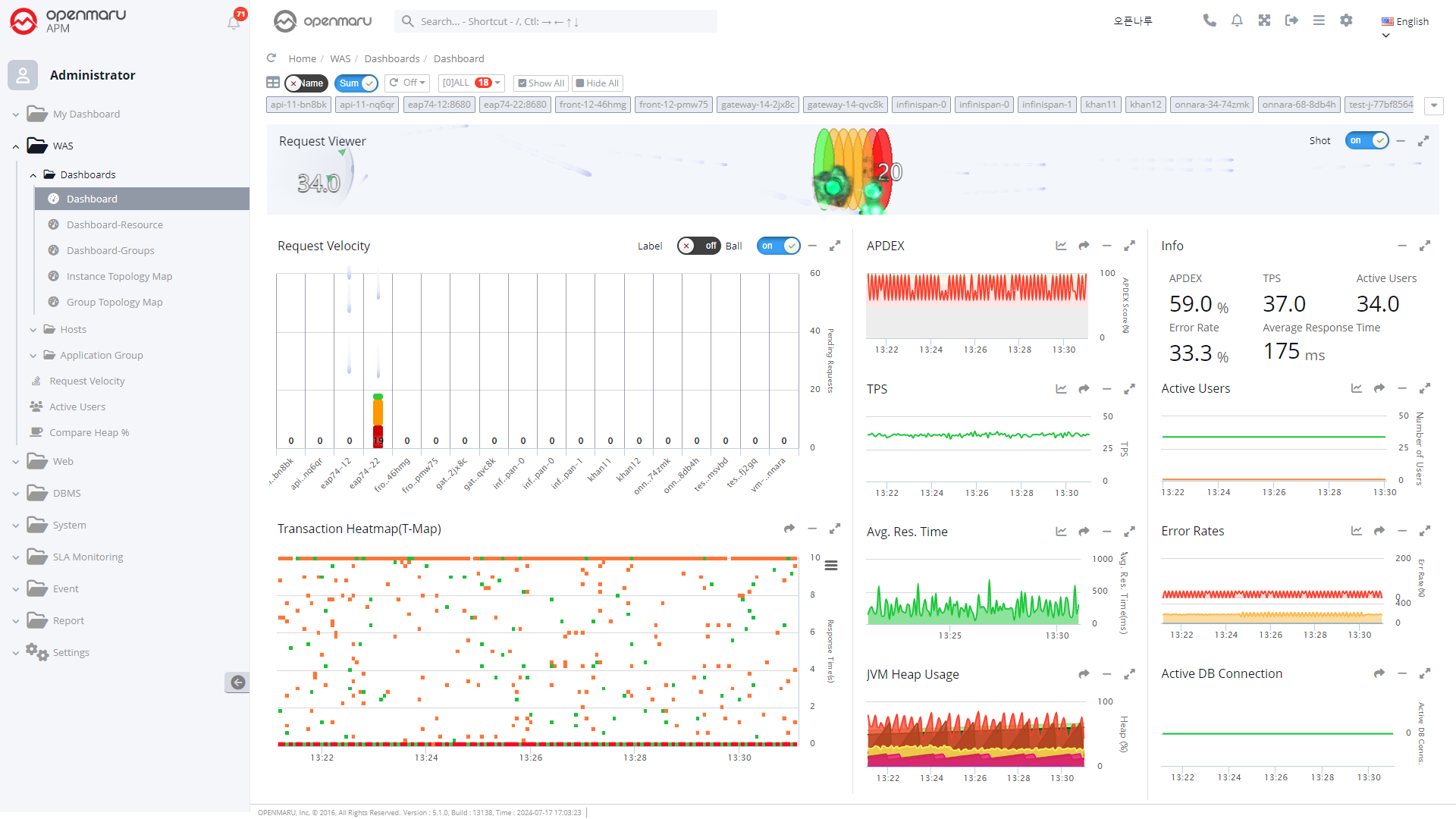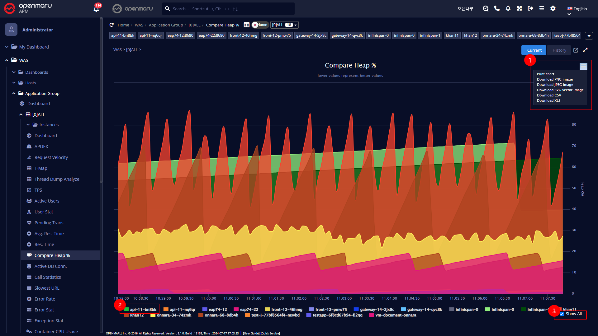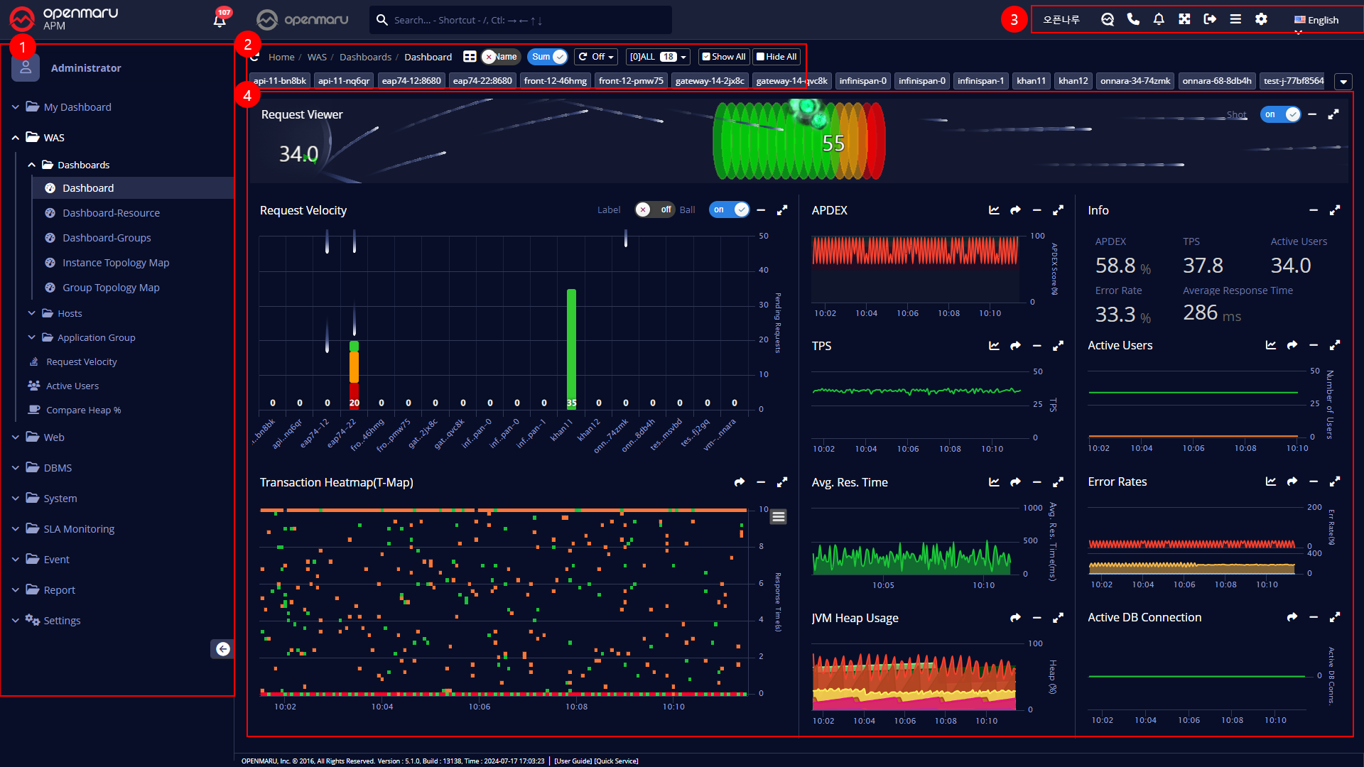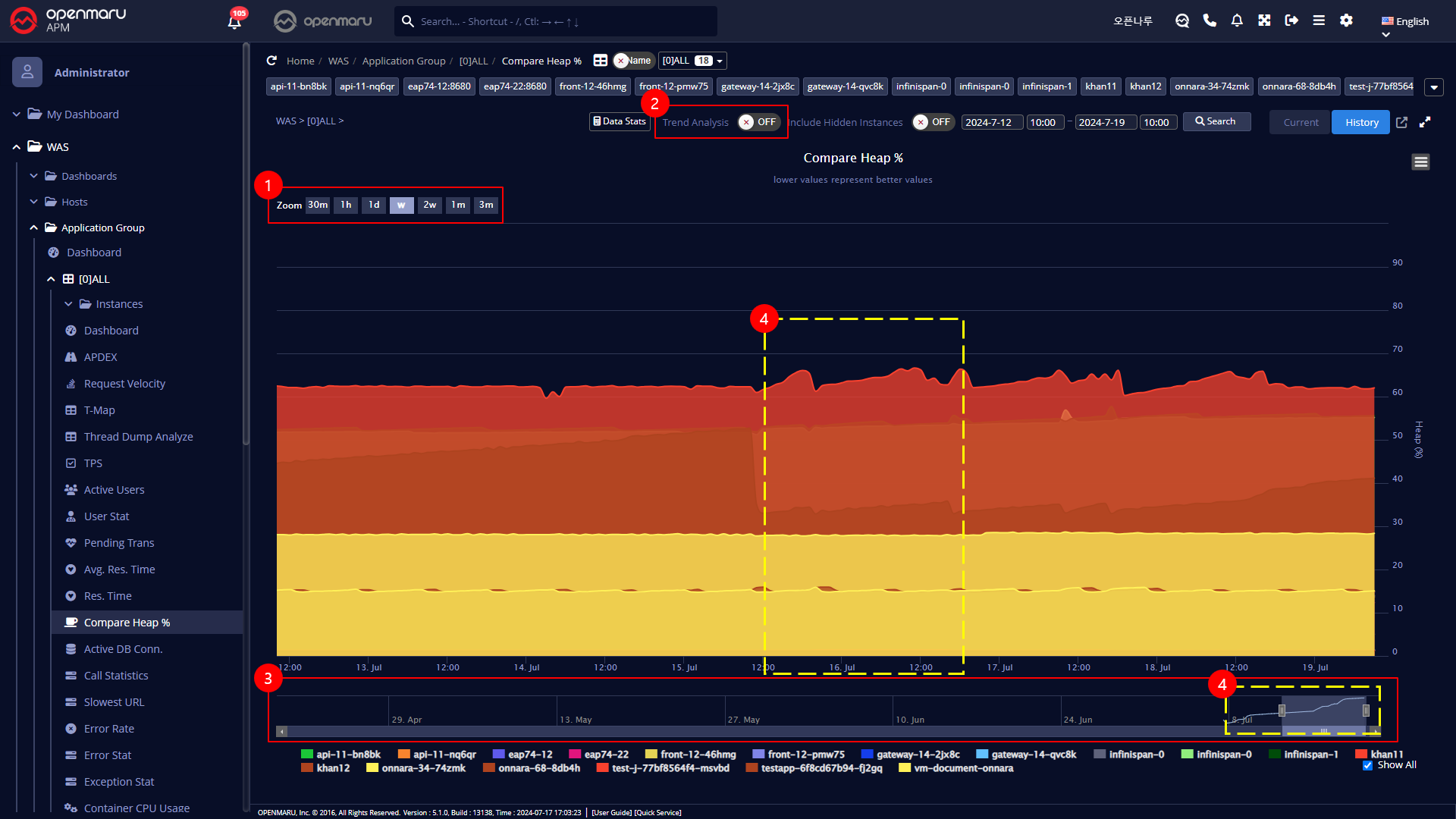 - 업무그룹 선택 : 업무 그룹을 선택하면, ④ 개별인스턴스도 해당 업무 그룹의 것으로 변경된다. WAS > 애플리케이션에 표시되는 차트들은 업무 그룹을 변경하면, 해당 업무 시스템에 대한 차트로 변경하여 표시한다.