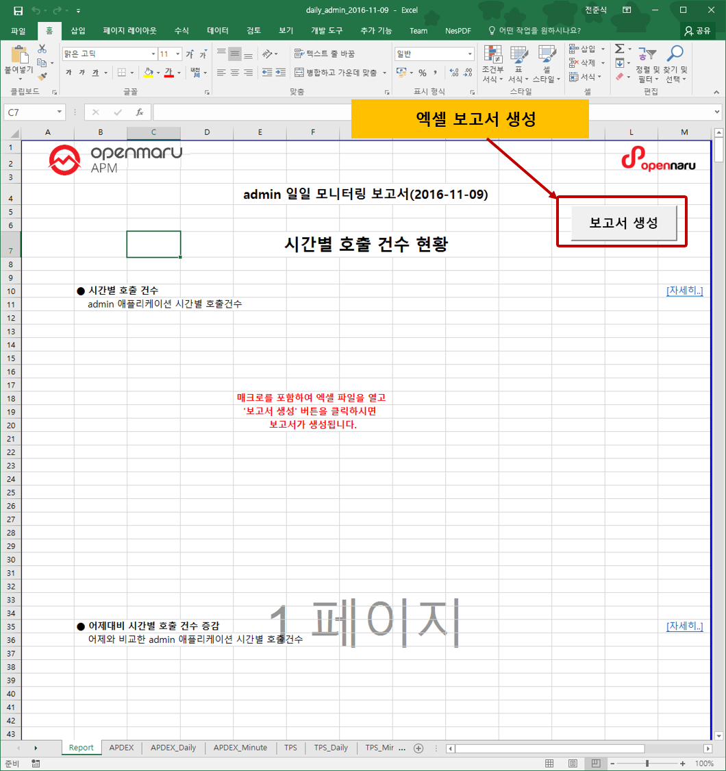 첫 화면에 ‘보고서 생성’ 버튼을 클릭하면 자동으로 엑셀 보고서가 생성된다.