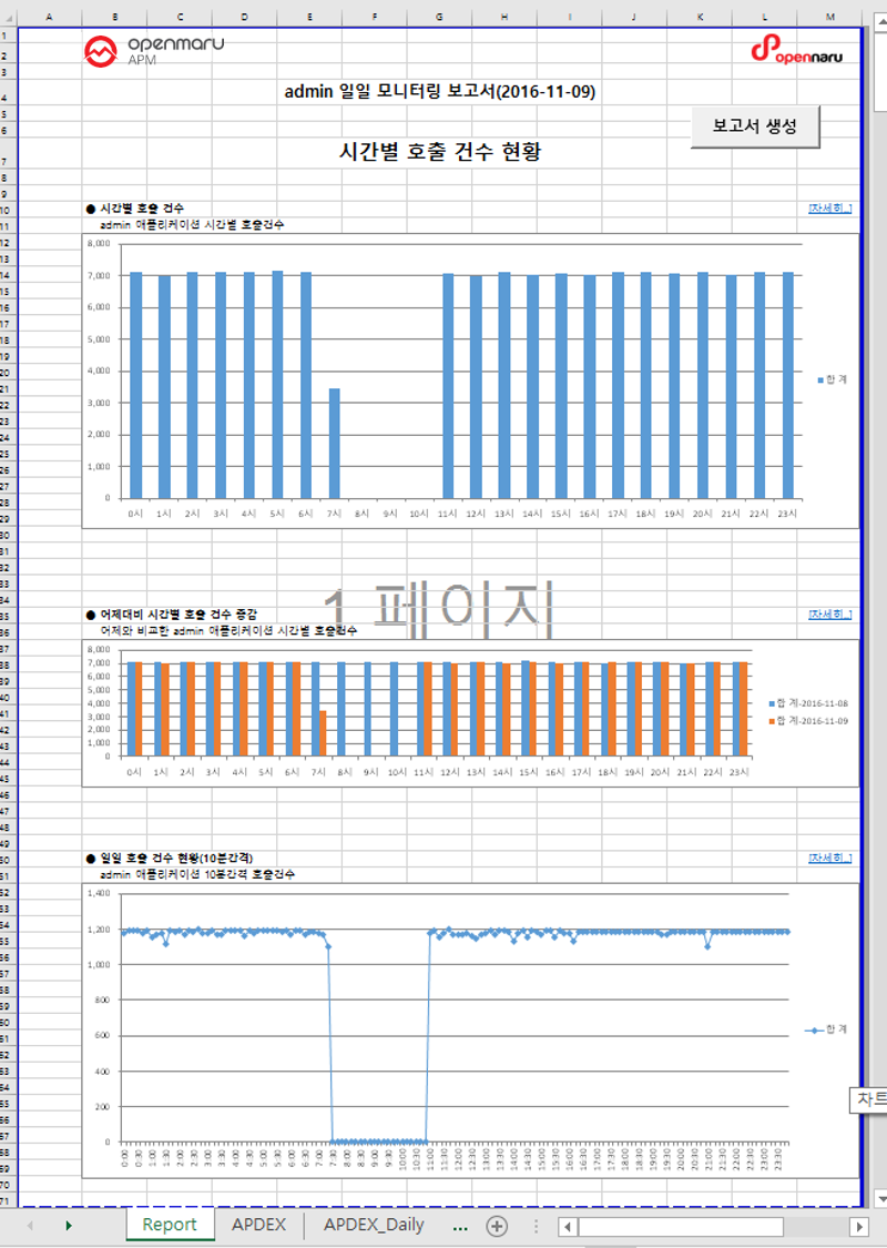 보고서는 시간별 호출 건수, 시간별 평균 응답시간, 시간별 APDEX, 시간별 TPS, 시간별 액티브 사용자, 시간별 오류율, 시간별 JVM Heap 사용율 현황, 시간별 시스템 CPU 사용율, 시간별 시스템 메모리 사용율, 느린 URL TOP 50, 느린 쿼리 TOP 50개를 각각의 항목별로 생성한다.