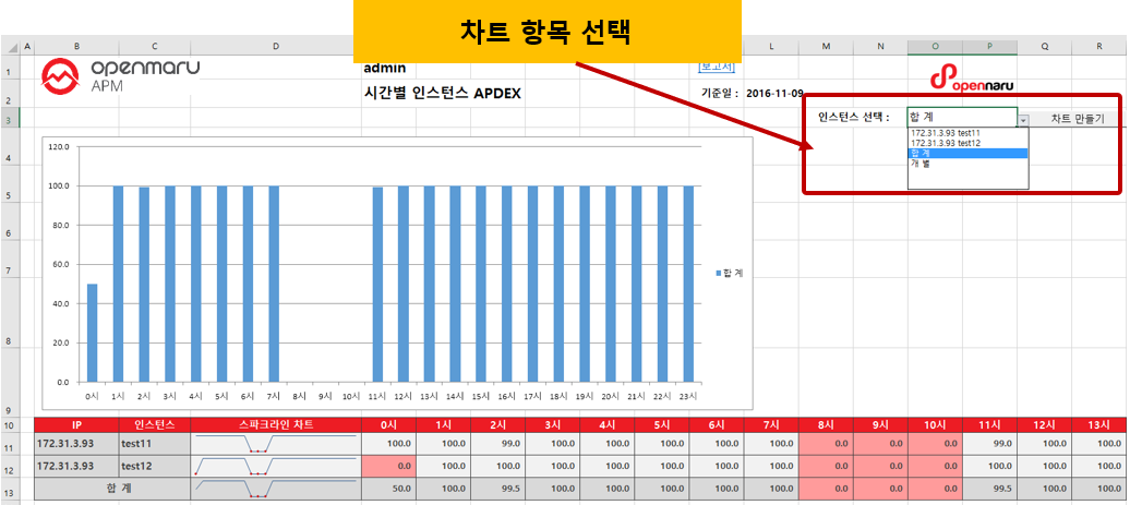 자동으로 생성한 그래프를 변경하려면, 다음과 같이 ‘인스턴스 선택:’ 메뉴에서 그래프로 출력하고자 하는 항목을 선택한 후 ‘차트 만들기’ 버튼을 클릭하면 해당 항목으로 그래프를 생성한다.