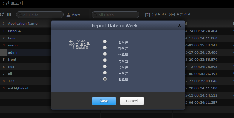 ‘주간보고서 생성 요일 선택’ 버튼을 클릭하여, 주간보고서 생성 요일을 선택할 수 있다. 예를 들어 ‘일요일’을 선택하면, 지난 월요일부터 일요일 자정까지의 통계를 월요일 새벽 33분에 생성하게 된다.