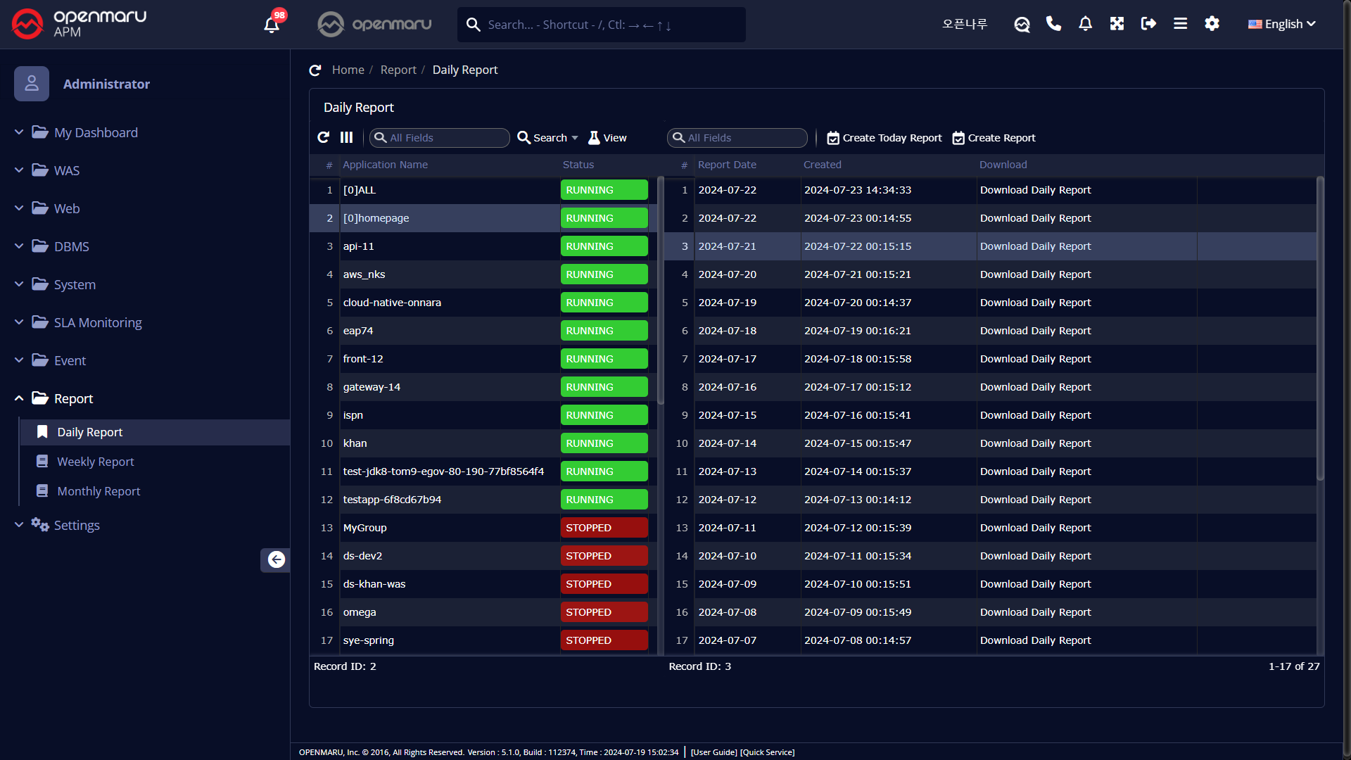 일일보고서는 각 애플리케이션 그룹마다 생성되며, ‘Report Date’는 보고서 내용의 날짜를 의미하며, ‘Created’는 보고서 엑셀파일이 생성된 날짜와 시간을 표시한다. ‘일일 보고서 다운로드’ 링크를 클릭하면 엑셀파일을 다운로드 한다.