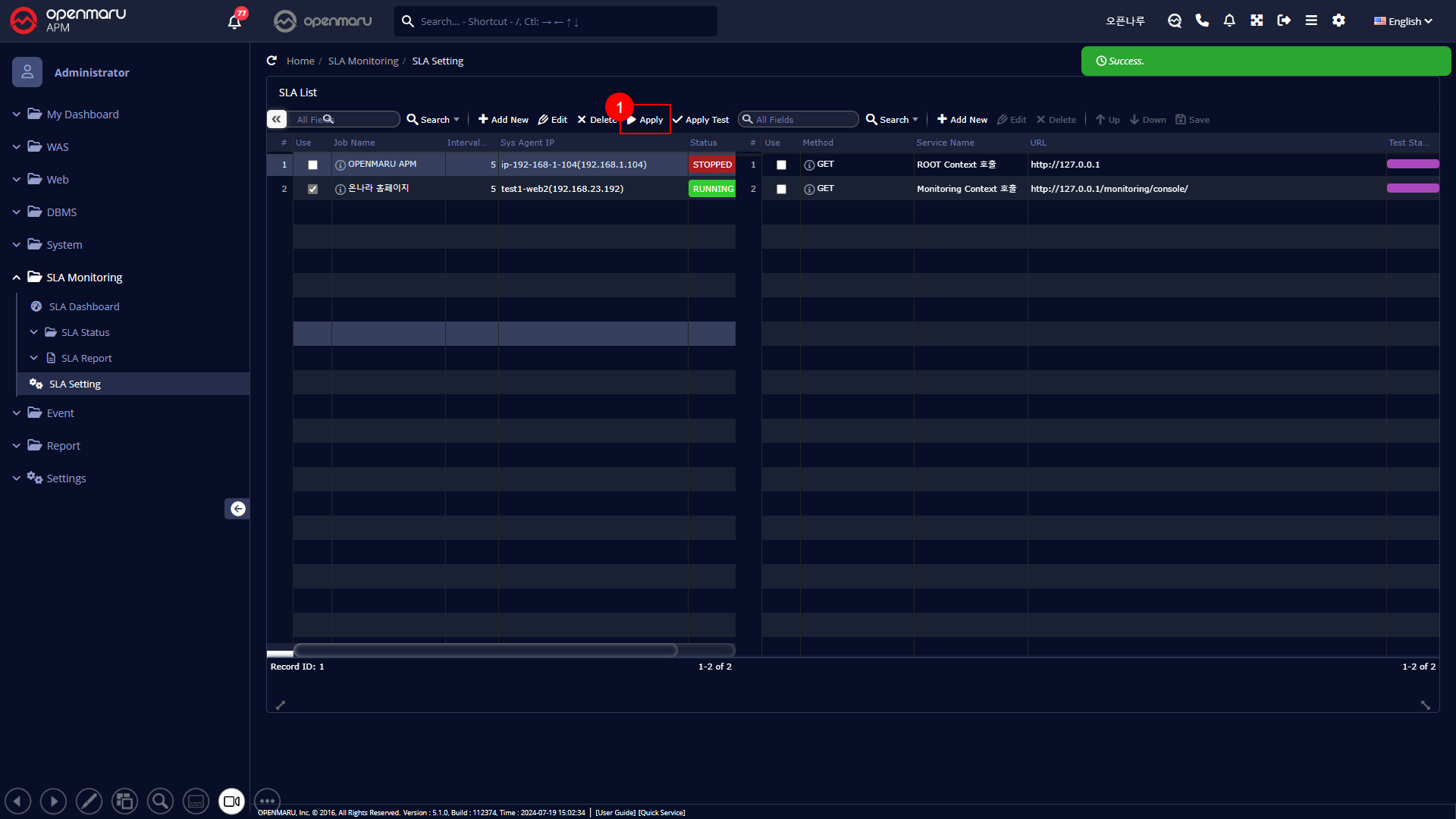 설정 및 수정 완료 후 적용 버튼을 누르면 전체 Job에 대한 내용이 각각의 시스템 에이전트 에 반영되어 헬스체크를 시작한다.