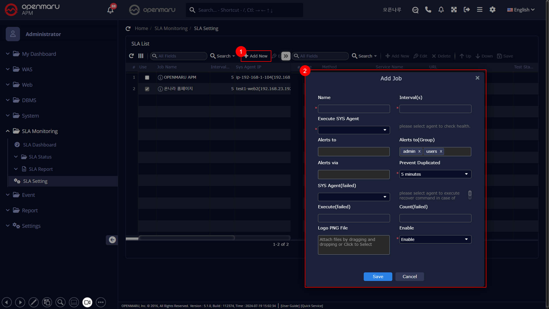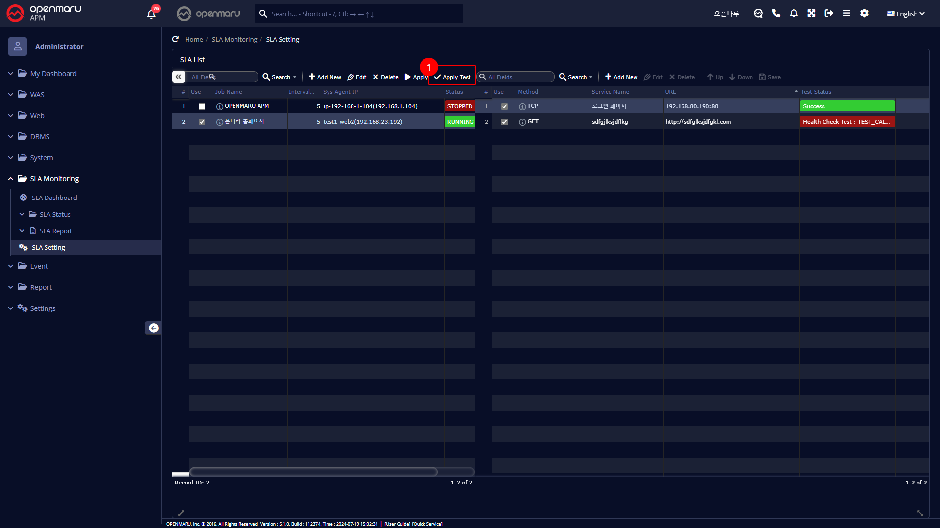 오픈마루 APM 의 SLA 기능을 사용하기 위해서는 OPENMARU APM 에 연결된 시스템 에이전트가 있어야 하며,
