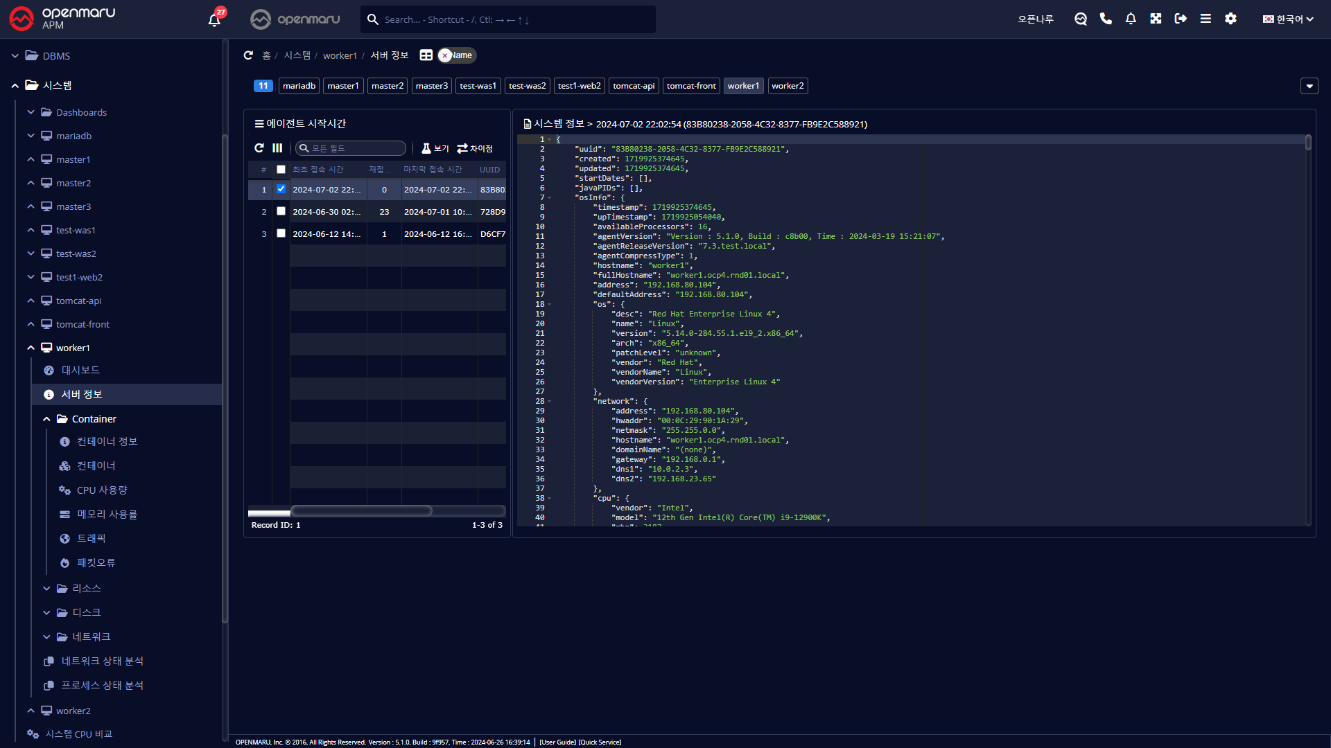 시스템 상태 모니터링 항목은 별도로 설치되는 System Agent를 통해 수집한다. 시스템의 CPU, Memory, Disk, Network 상태를 모니터링하여 정보를 그래프로 표시한다.