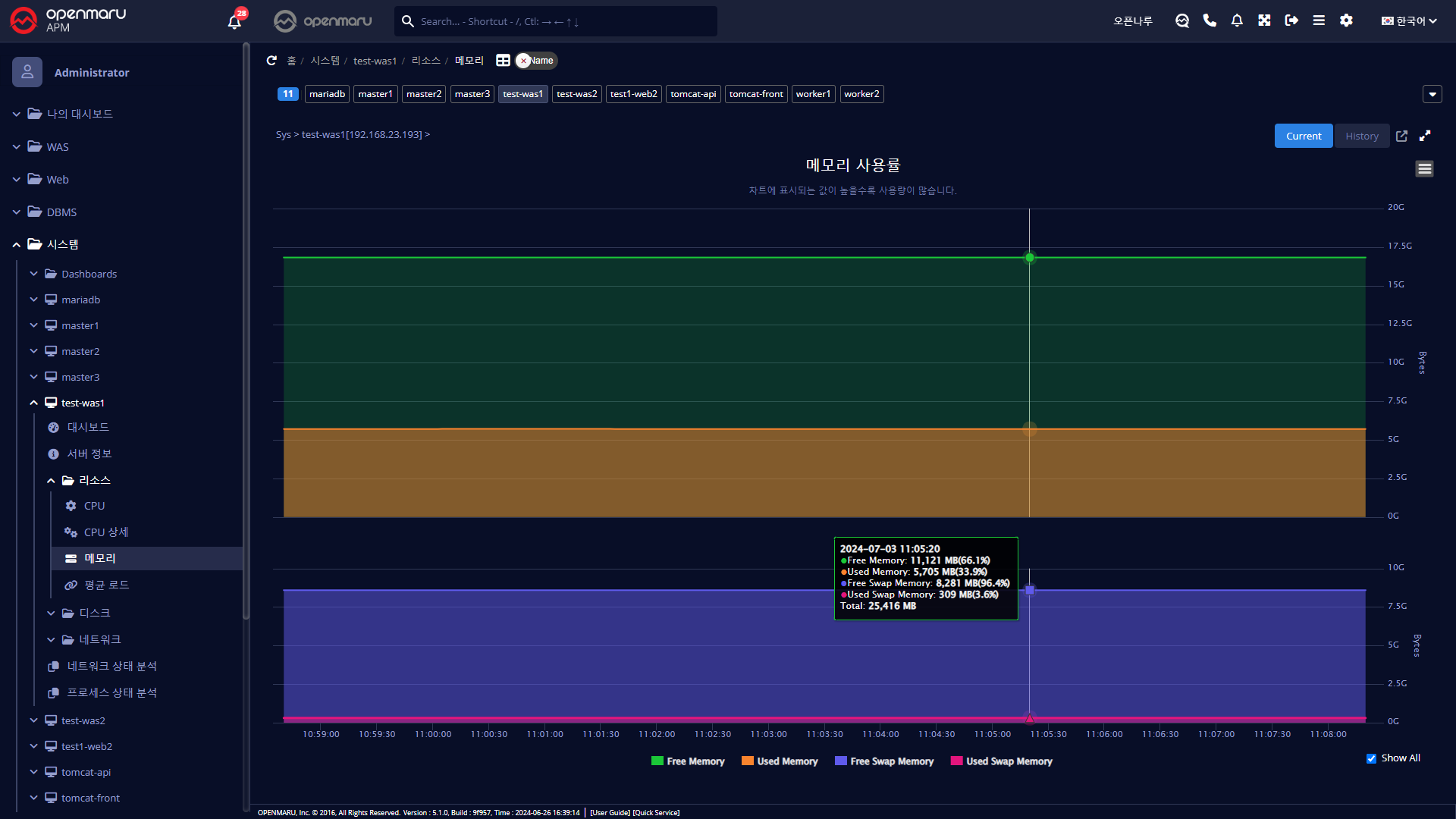 시스템의 메모리 사용량과 Swap 사용량을 그래프로 출력한다. 전체 메모리와 현재 사용중인 메 모리 크기와 설정한 전체 Swap 메모리 크기와 Swap 메모리 사용량을 표시한다. Swap 메모리는 Disk에 파일 시스템을 메모리로 사용하는 방식이다. 따라서, 시스템의 물리적 메모리가 갑자기 부족한 상황을 제외하고는 운영시스템에서 Swap 메모리를 사용하게 되면 시스템의 전체적인 성능이 크게 떨어지게 된다. OS상에서 실행되는 JVM > 애플리케이션의 성능에도 큰 영향을 미치기 때문에 Swap 사용량을 확인하는 것이 좋다.