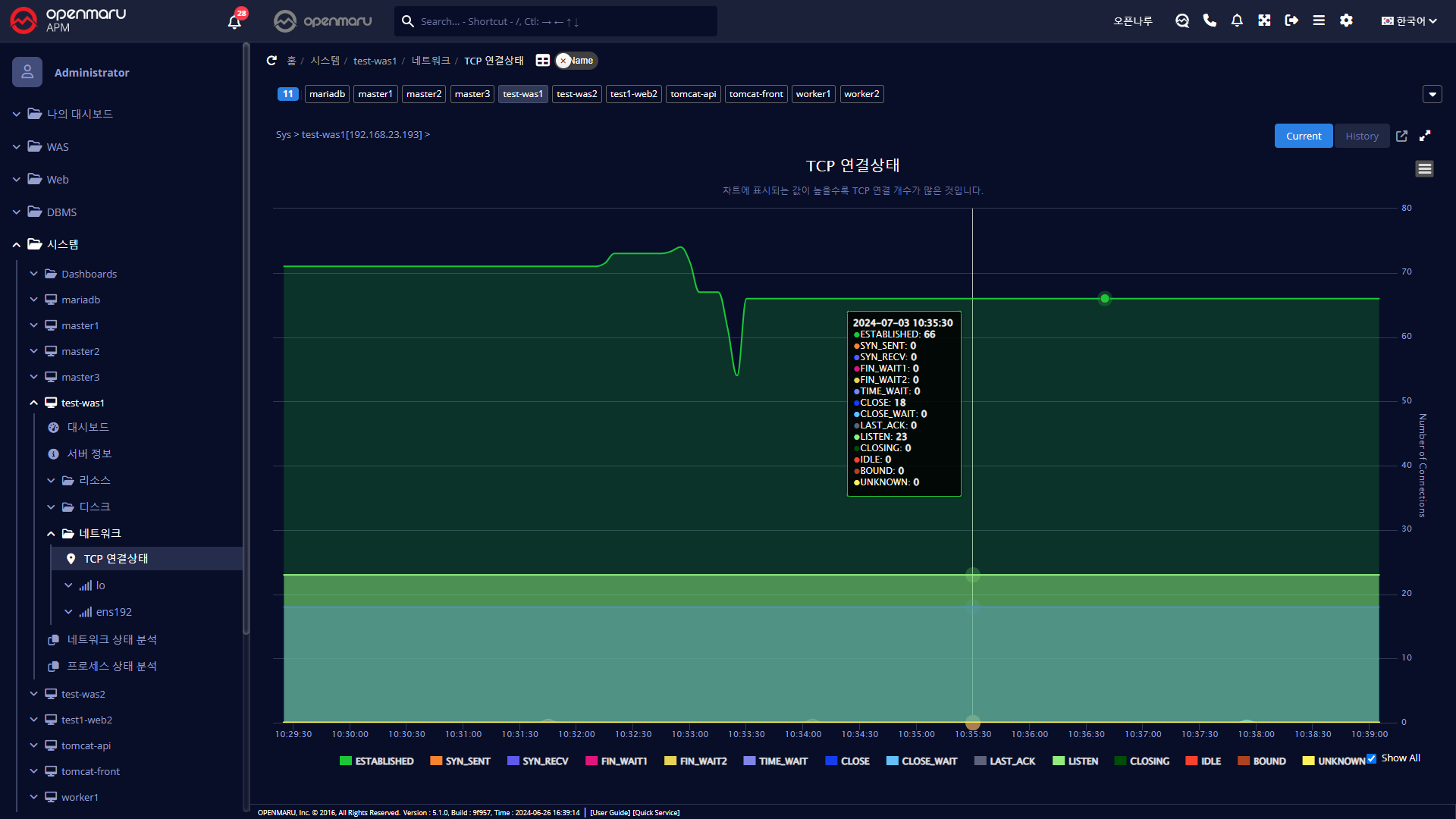시스템 전체 Network TCP 연결 상태 정보를 그래프로 표시한다.