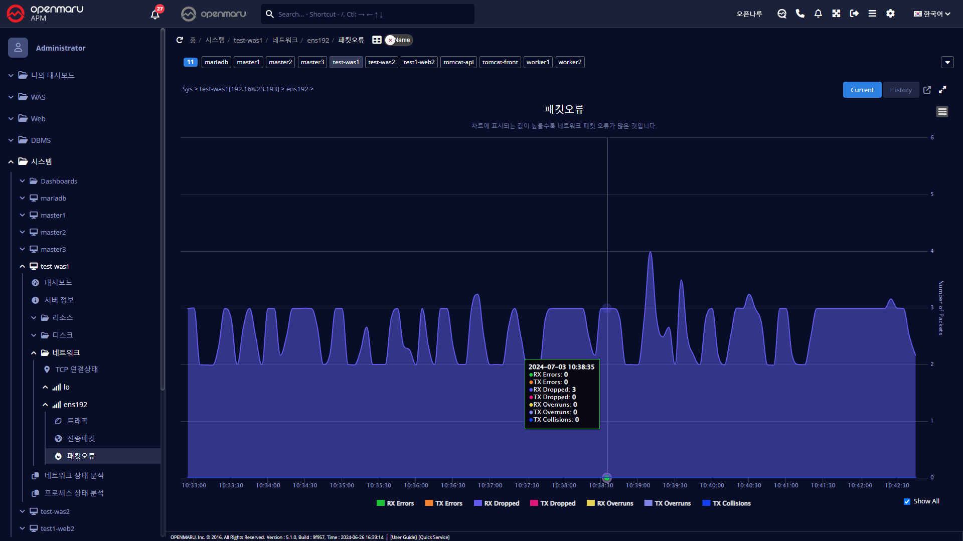 시스템의 네트워크 인터페이스 카드 별로 데이터 초당 Send/Receive 패킷 수를 그래프로 표시한다.