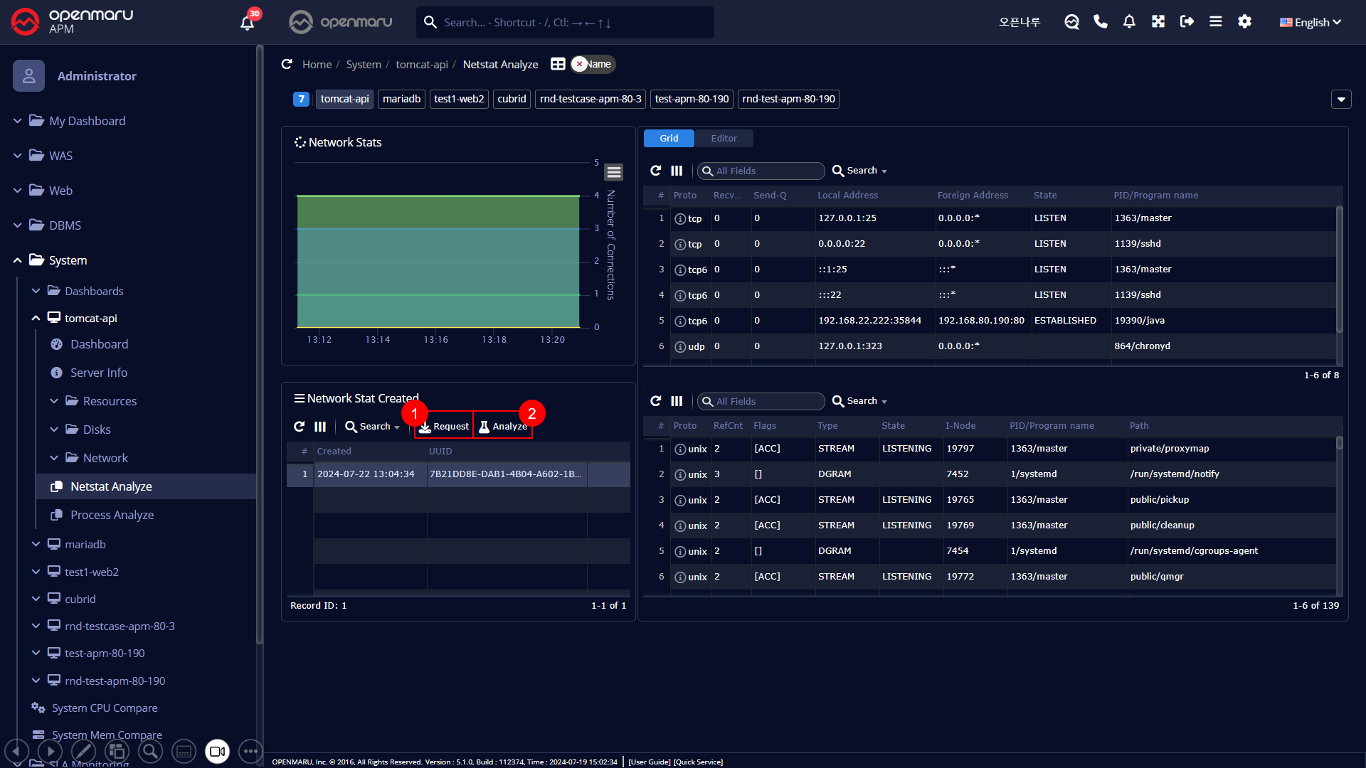 ‘시스템 > 네트워크 > TCP 연결 상태’에서는 TCP 연결의 상태를 개수로만 확인할 수 있었다. 만약 특정항목이 과도하게 많이 늘어나게 되면, 어떤 포트, IP 주소에서 이런 상황을 야기했는지 확인이 필요하다. 네트워크 상태 분석에서 좌측의 ‘요청’ 버튼을 클릭하면 현재 시점에 TCP 연결상태의 개별 항목을 분석할 수 있다.