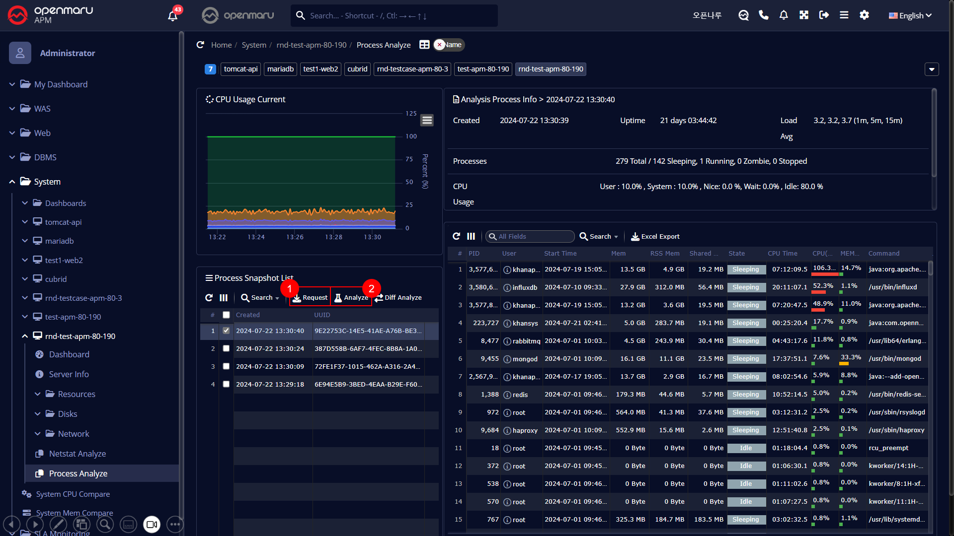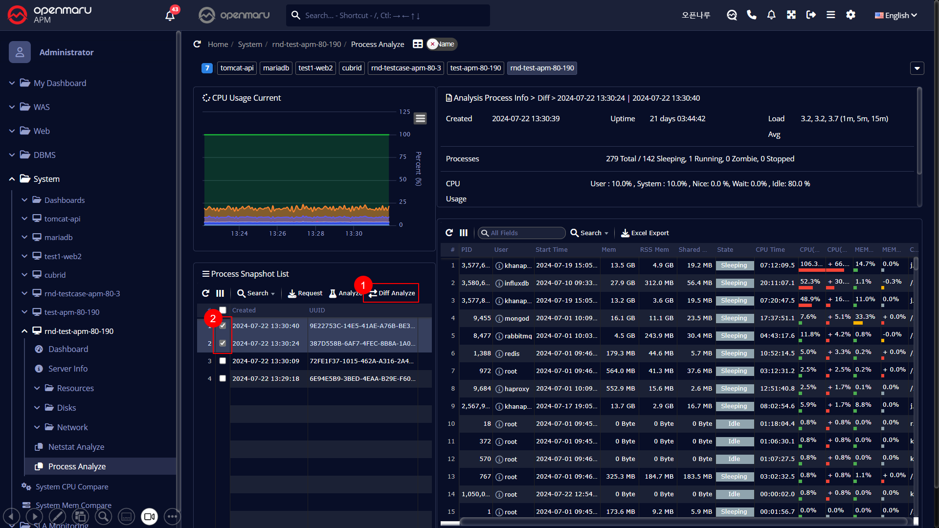 '차이 분석'을 통해서 전/후 프로세스의 CPU/MEMORY 사용 변동률을 확인할 수 있다.